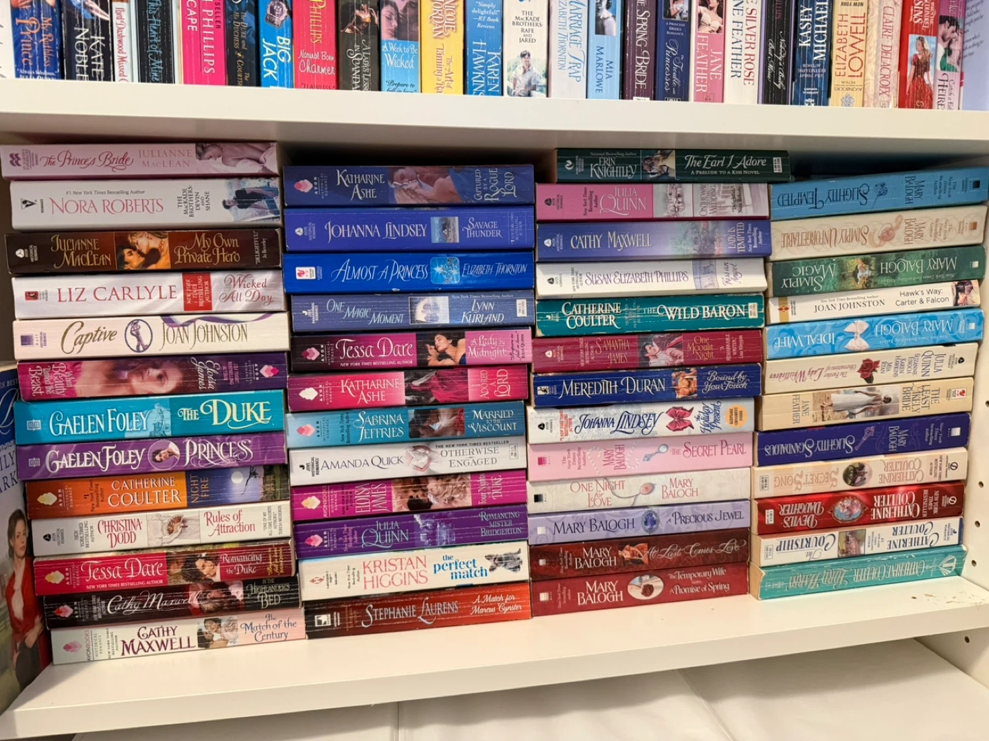 A stack of paperback romance novels by various authors including Nora Roberts, Julia Quinn, and Mary Balogh. Titles vary across historical and contemporary romance genres. Great for any romance reader's collection!
