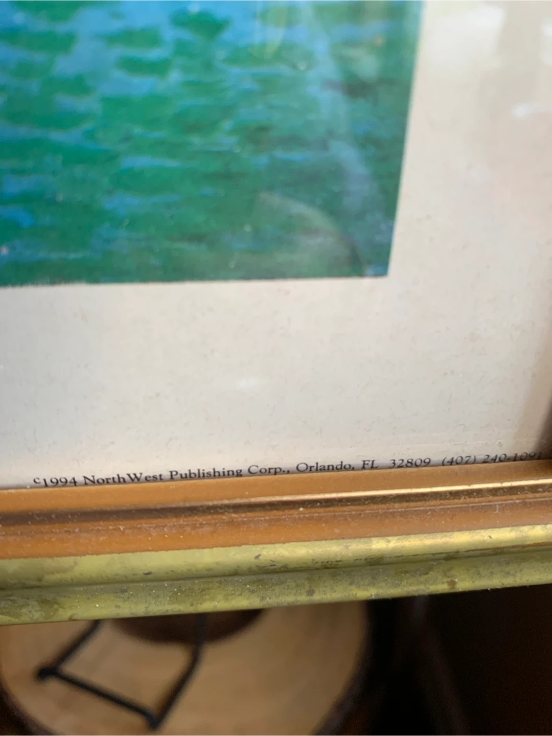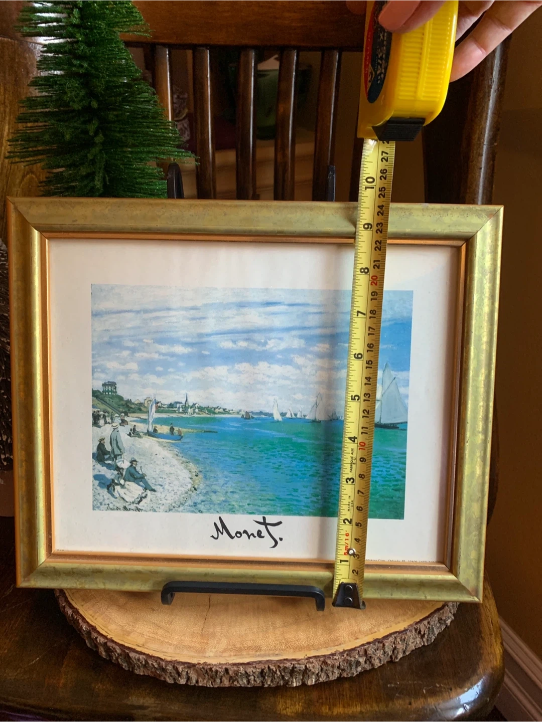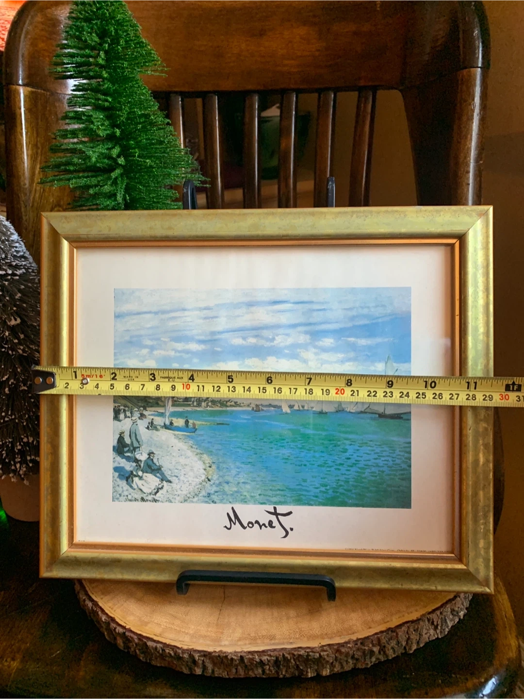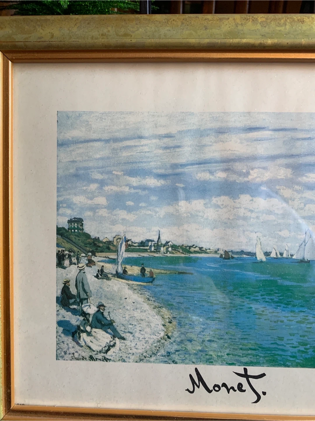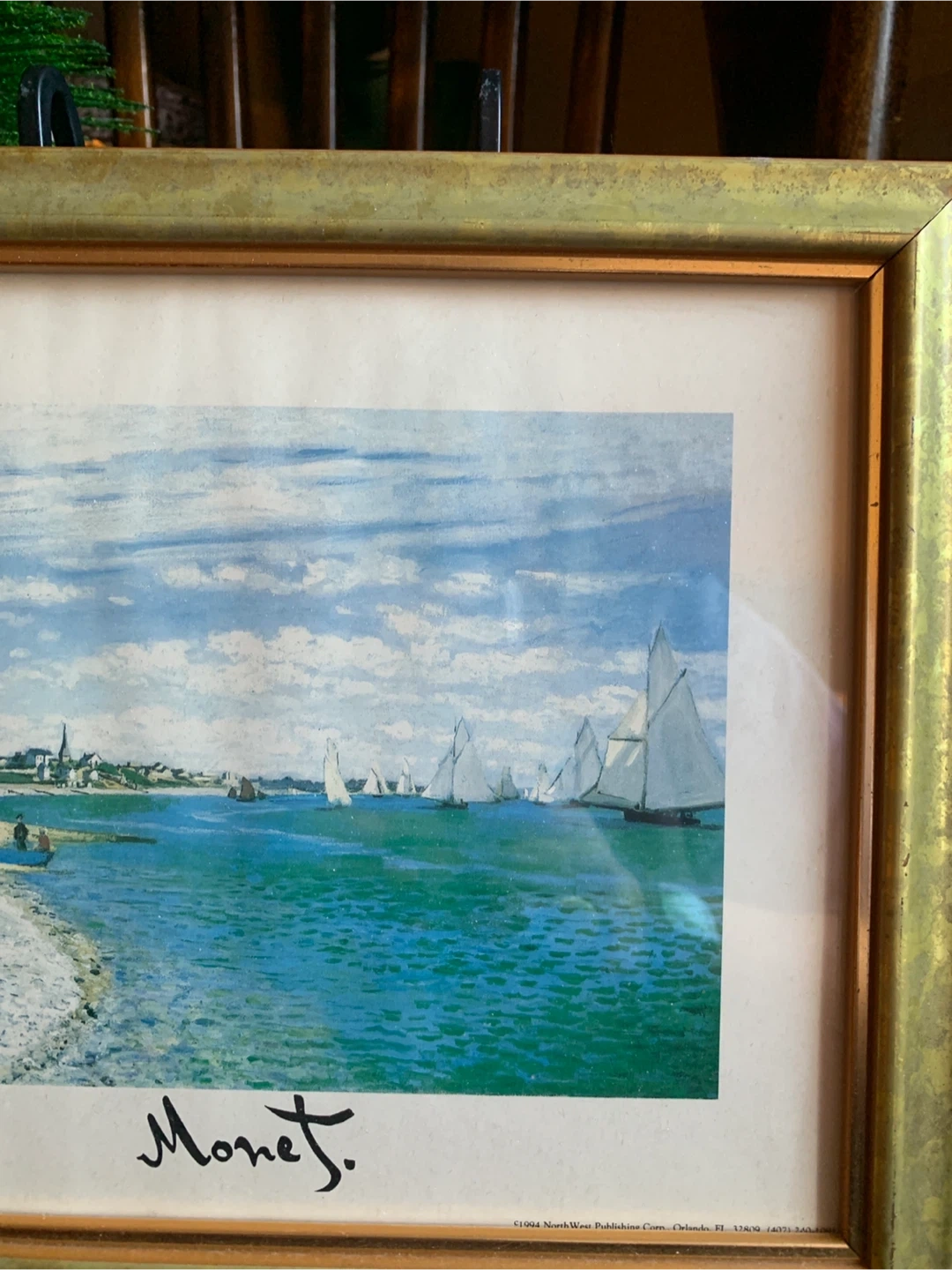 This framed vintage print showcases Claude Monet's famous Impression, “Regatta at Sainte- Addresse” painting from 1867. It's in a gold-toned frame with a caramel coloured border behind the gold. The print is from NorthWest Publishing Corp. dated 1994. It's ready to hang and would add a touch of classic art to any room!