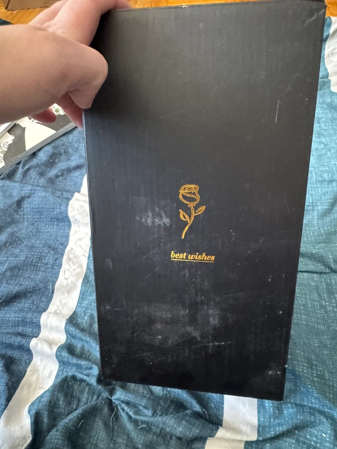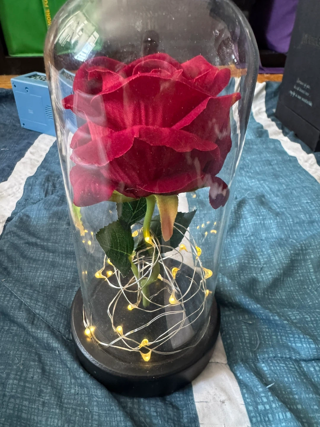 This is a decorative dome with a preserved red rose and warm LED fairy lights. The dome has a black base and comes in a black box with "best wishes" printed on it. It's a lovely piece for home decor.