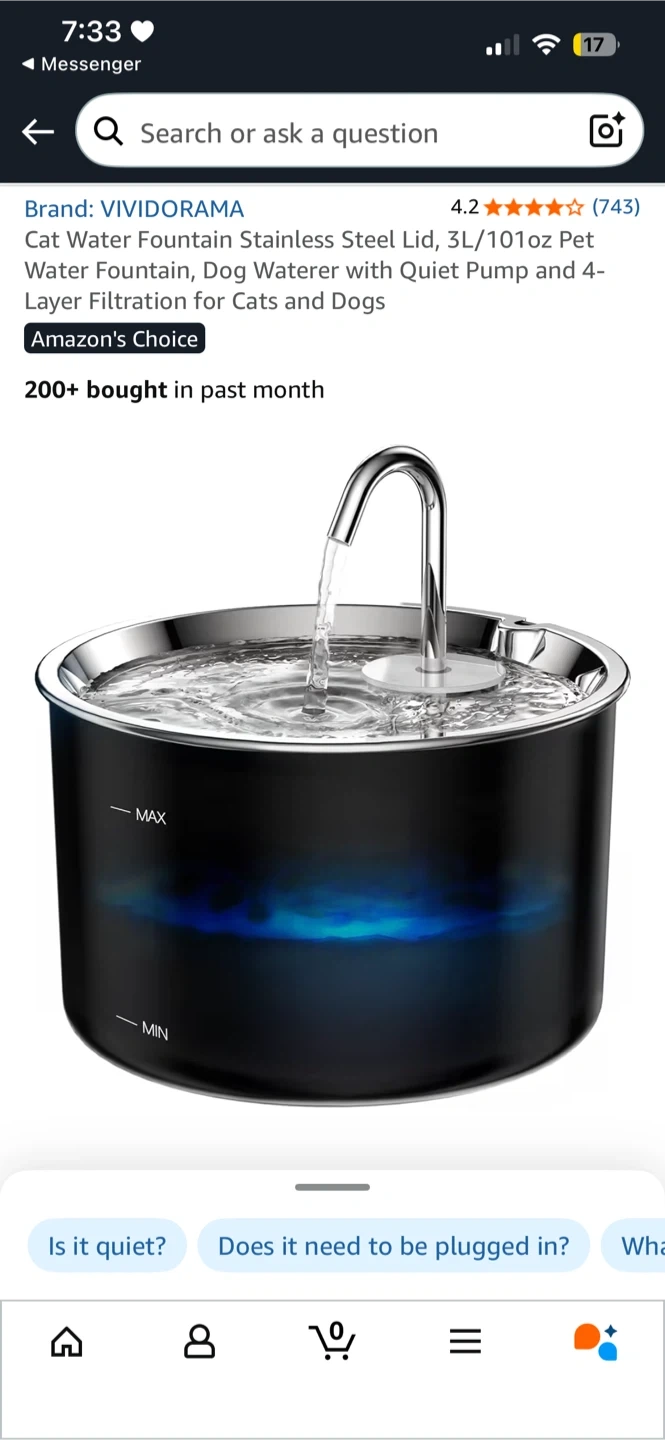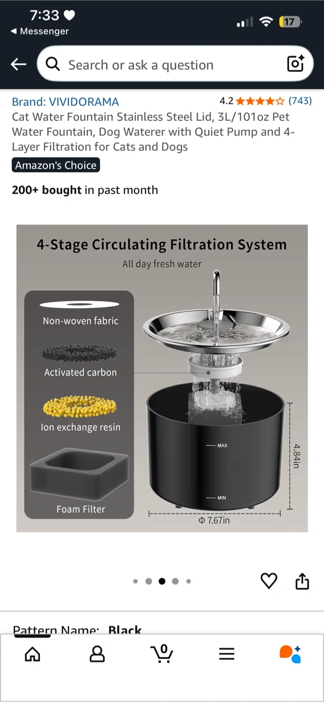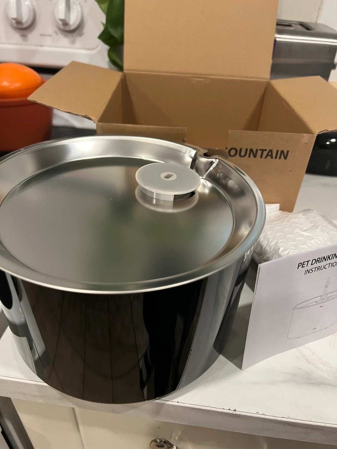 This is the VIVIDORAMA Cat Water Fountain with a 3L capacity. It's made with a stainless steel lid and has a quiet pump. The 4-layer filtration system keeps water fresh. Its new and unused