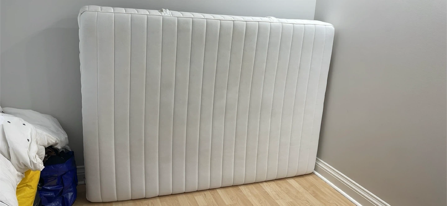 Valenag mattress for sale. White upholstered surface with vertical stitching. It's a comfortable mattress.