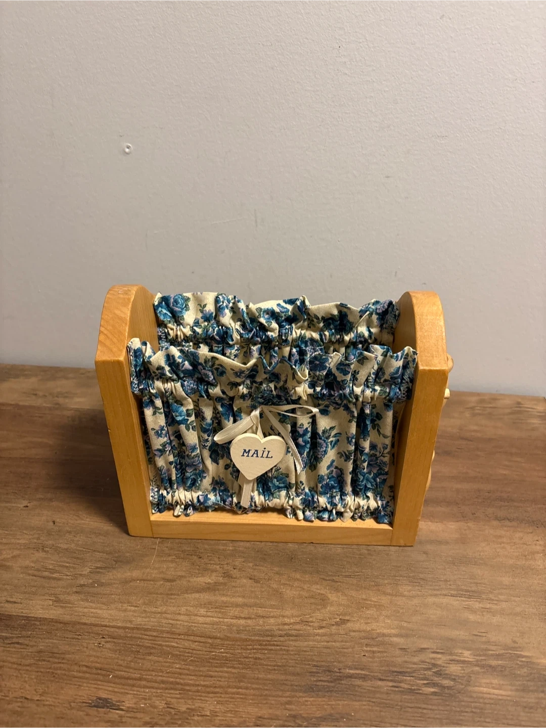 This charming wooden mail sorter features a floral fabric lining. It's perfect for organizing letters and documents on a desk or entryway table. The wood frame has a natural finish and includes a decorative 'MAIL' heart charm.