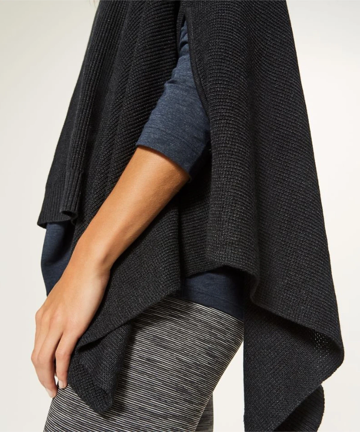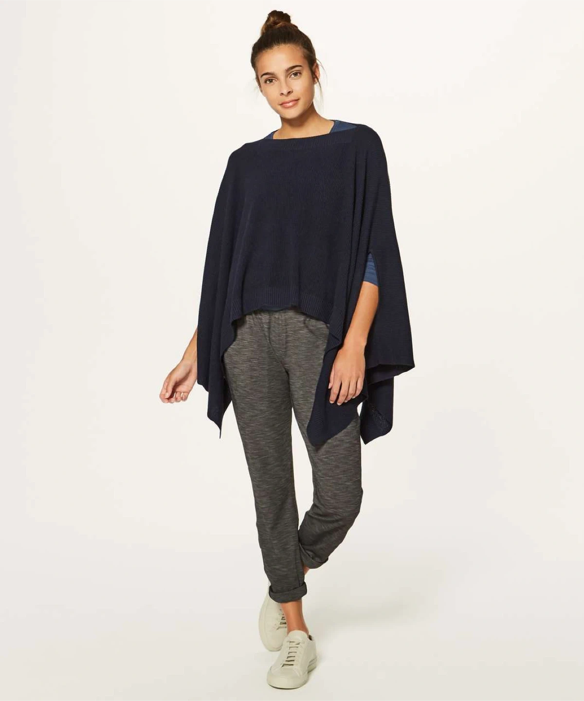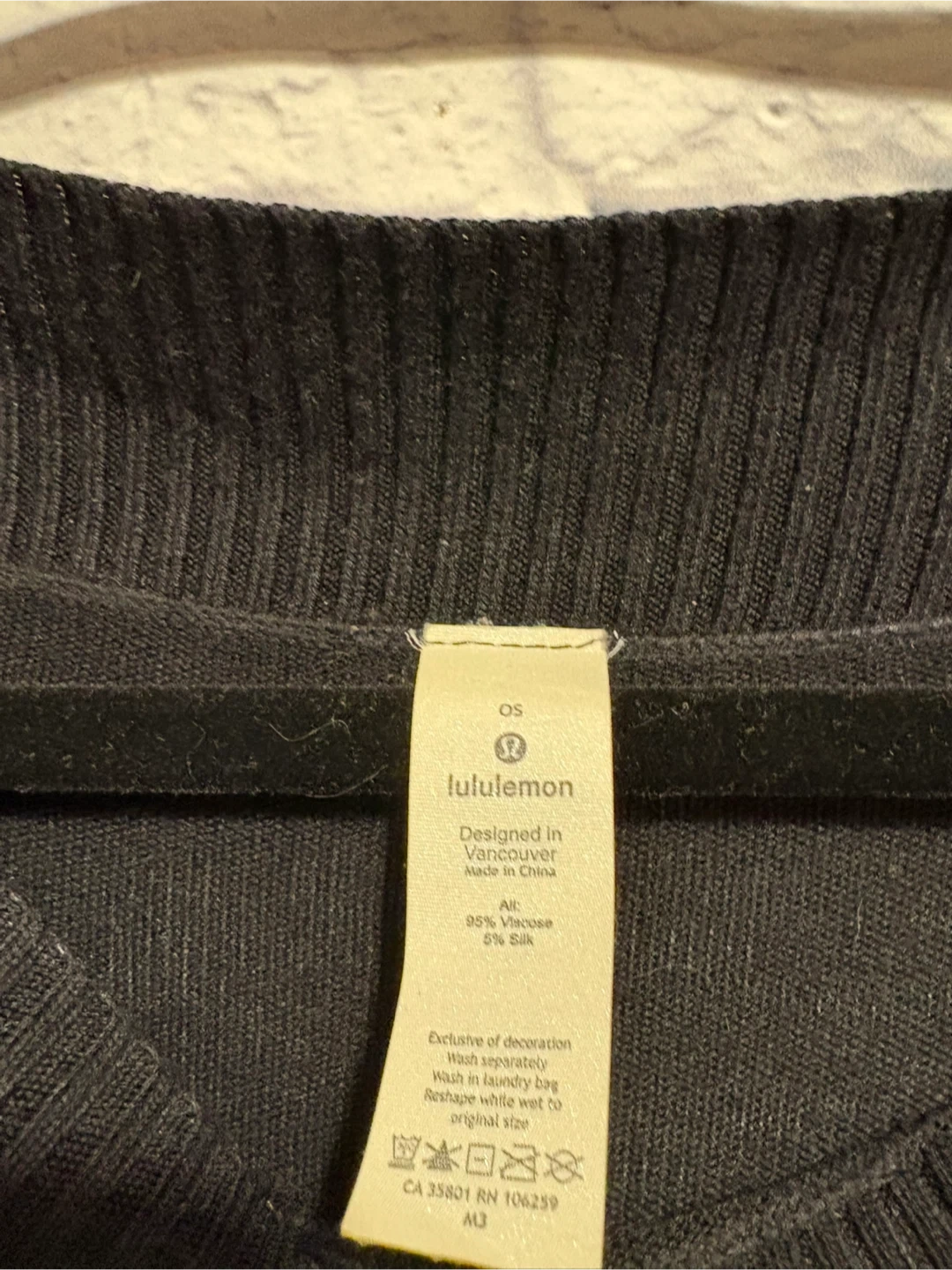 This Lululemon poncho sweater is one size fits all. It's made with a blend of 95% viscose and 5% silk. This piece is designed in Vancouver and made in China. It's a great layering piece for cooler days! Overall great condition, some light pilling. Pick up only.