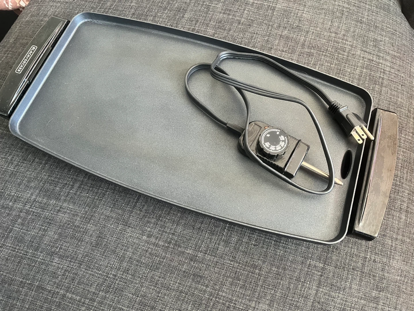This is a Black + Decker electric griddle. It has a non-stick cooking surface and an adjustable temperature control. The drip tray is removable for easy cleaning.