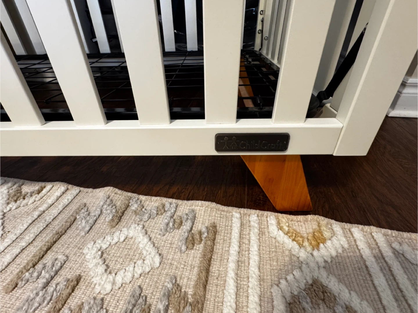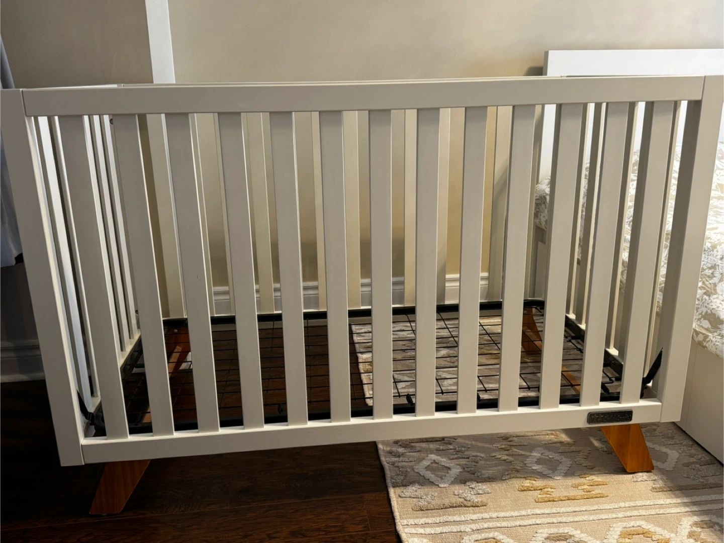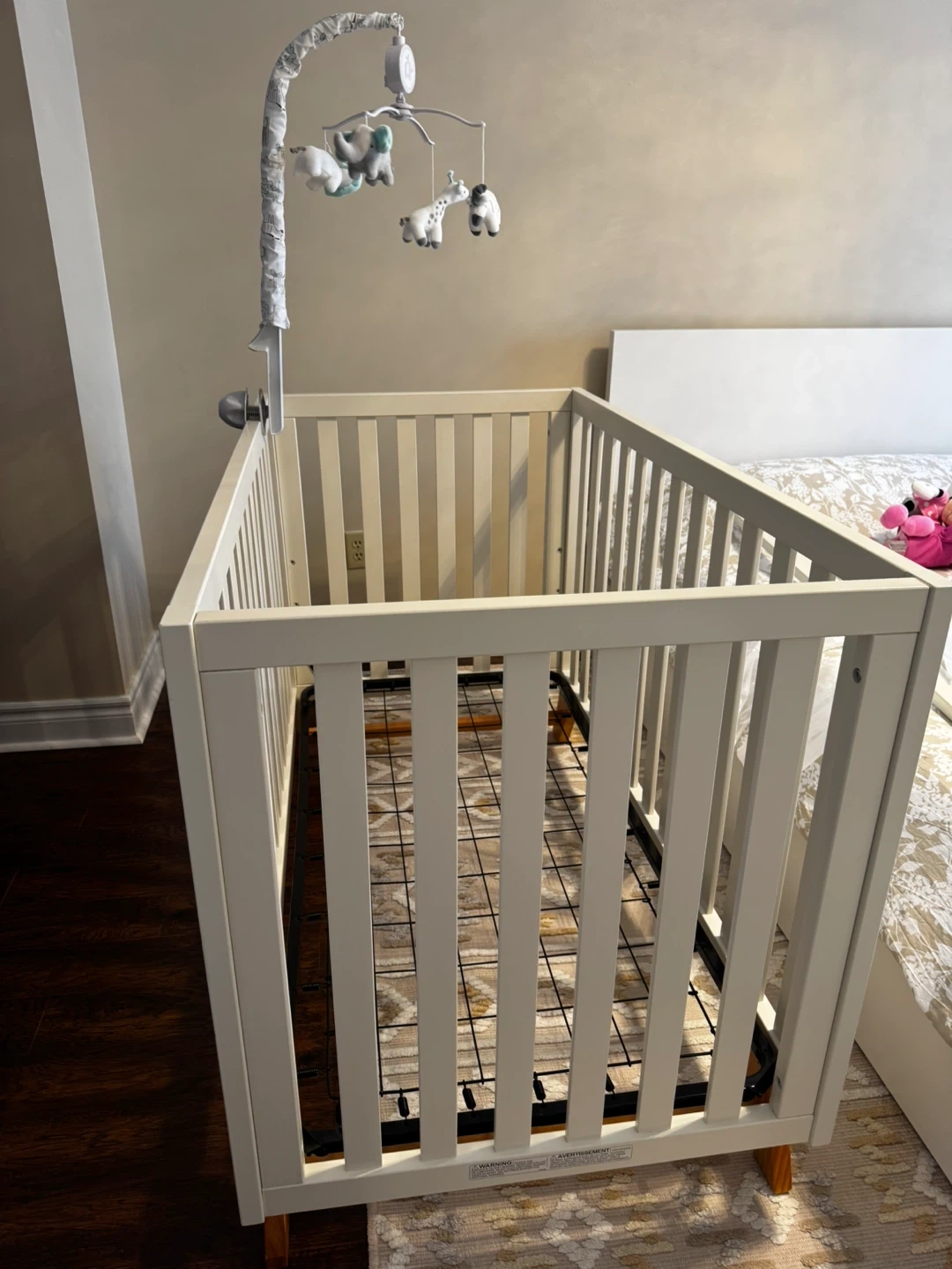 White wooden Child Craft crib with a metal mattress support. This crib is designed for infants- toddler phase. It has sturdy wooden legs and 3 height level options. Light weight to move around. Mattres with 2 side for infant and toddler with cooling design, never used before. Crib musical mobile, bed sheet and mattress protector for free.