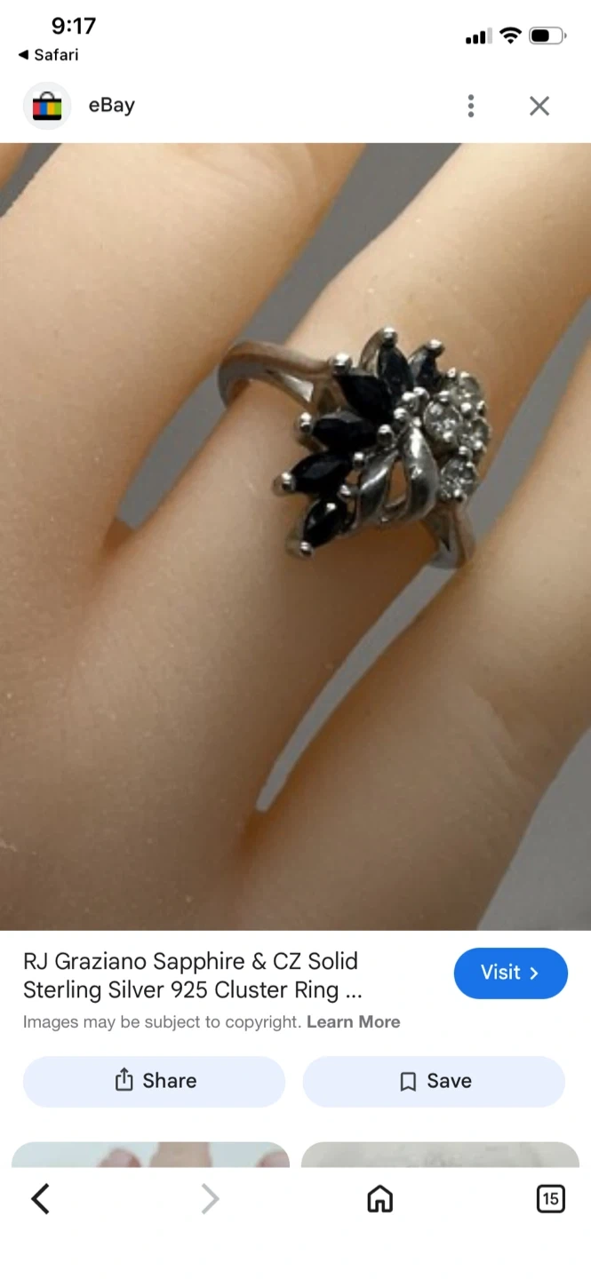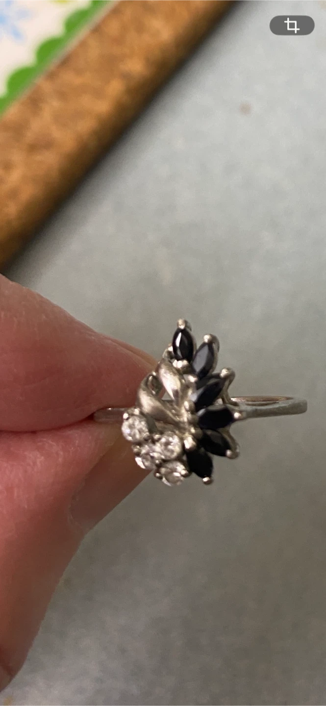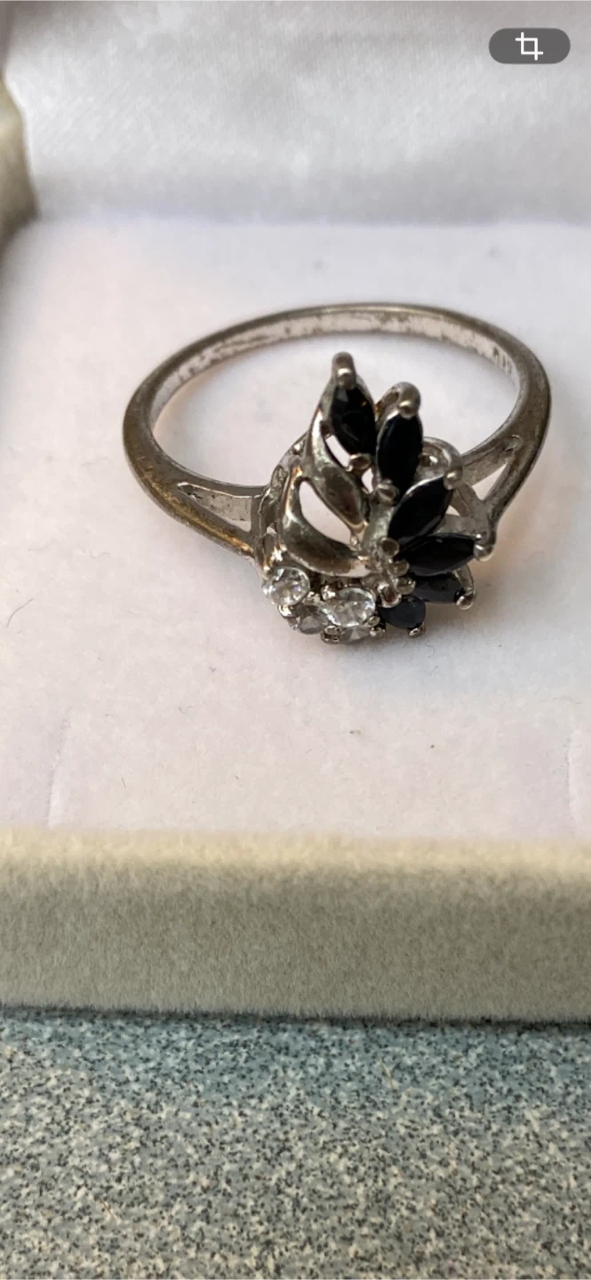 Sterling silver ring featuring a cluster of black sapphires and clear cubic zirconia stones. It's marked 925 for sterling silver content. This ring would be a nice addition to any jewellery collection. Has initial R.J and 925 inside ring. Has a bit of wear on it can be polished.