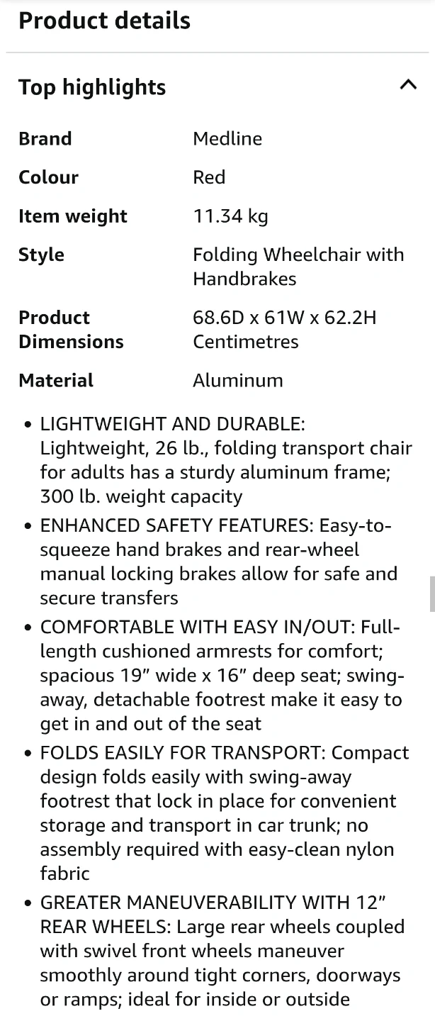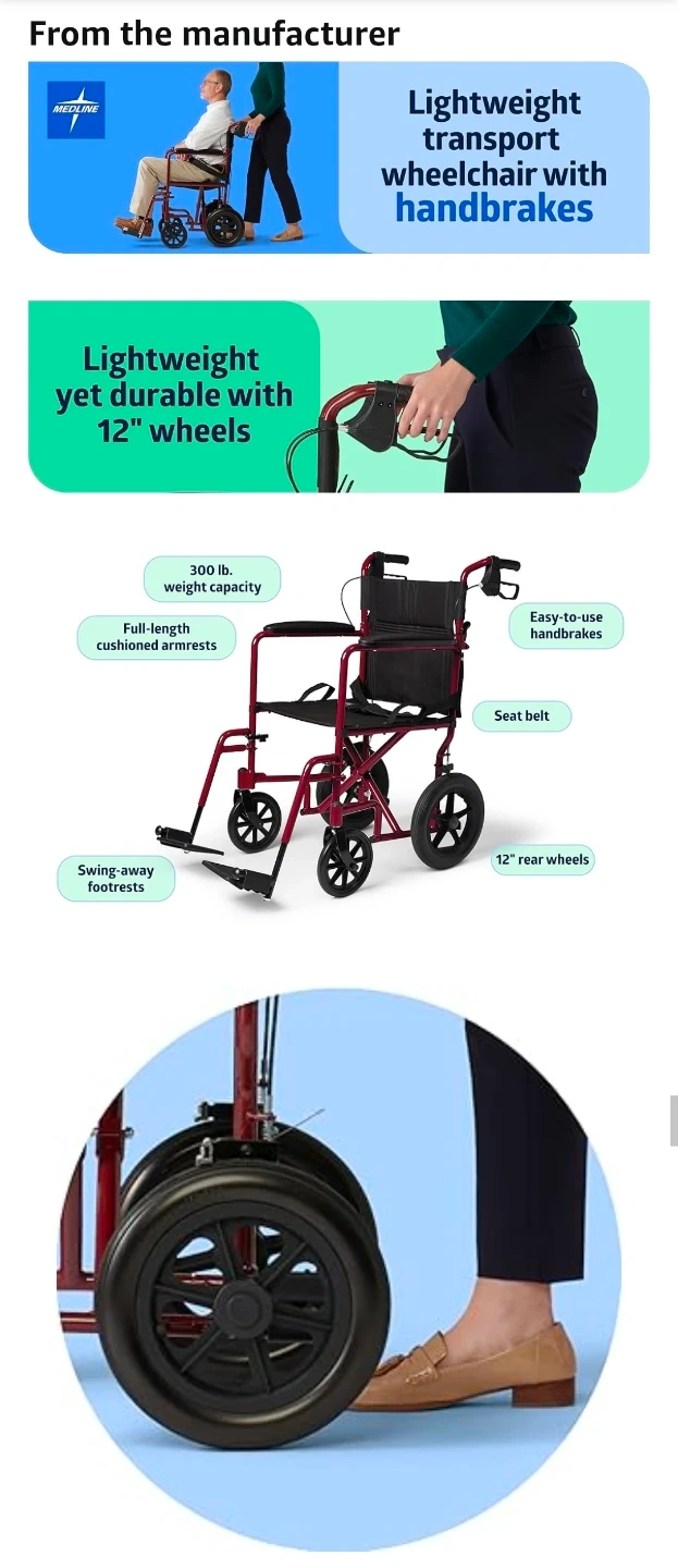 I'm offering a like new Medline Lightweight Transport Wheelchair, perfect for adults with its 12-inch wheels and handbrakes. This folding transport chair is lightweight and durable, featuring a sturdy aluminum frame with a 300 lb weight capacity.