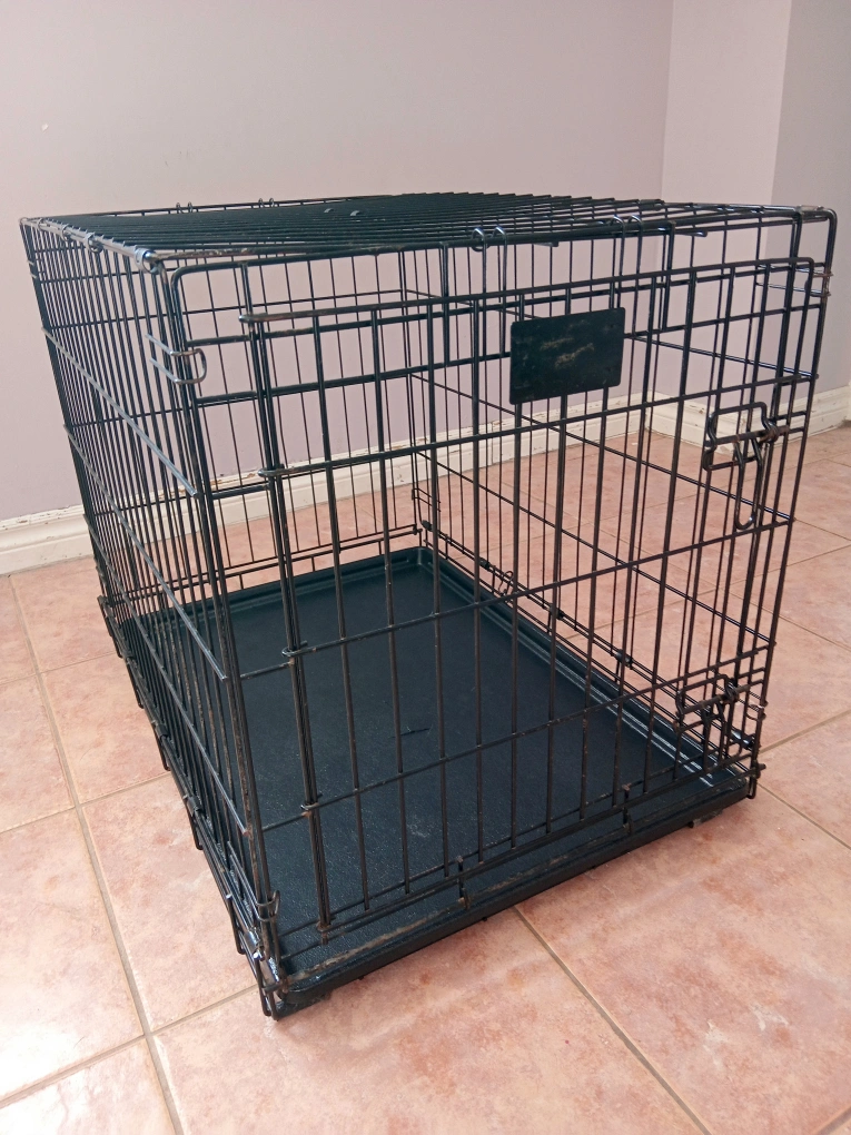 This is a black wire, single door, dog crate with a removable plastic tray. It folds flat for storage. This crate is handy for training or travel.