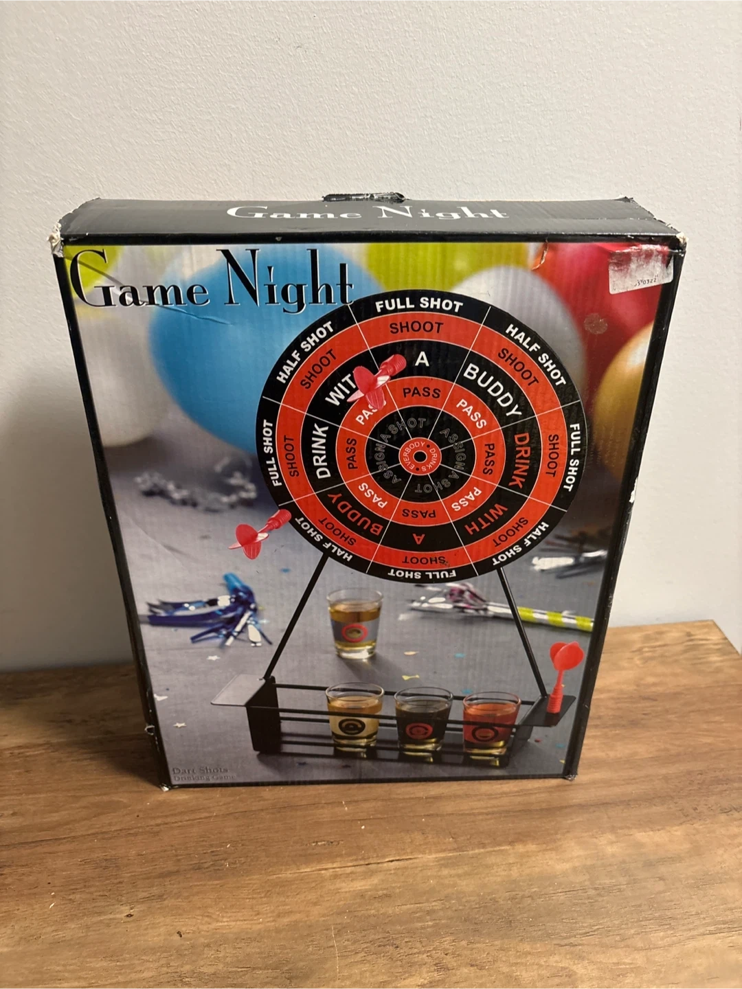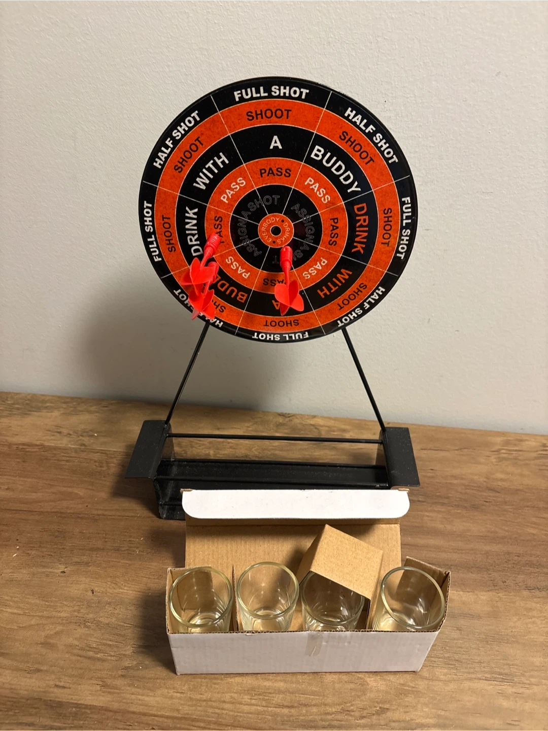 Fun shot glass dartboard game set. Includes the dartboard, stand, darts, and four shot glasses. Great for parties or casual get-togethers!