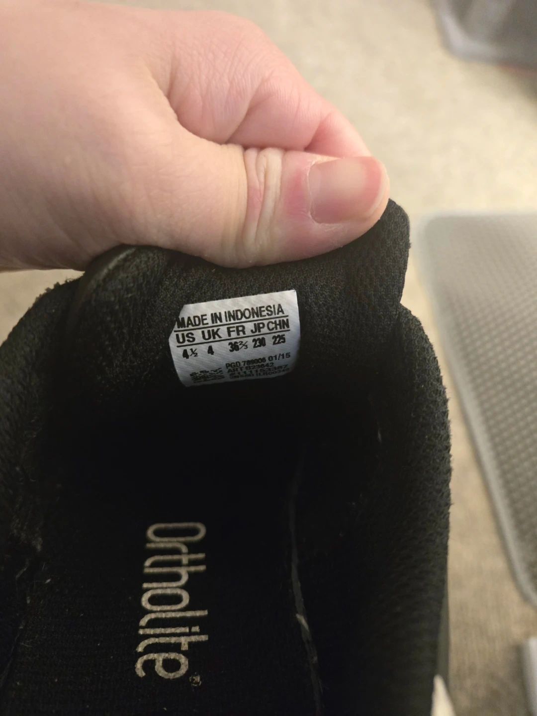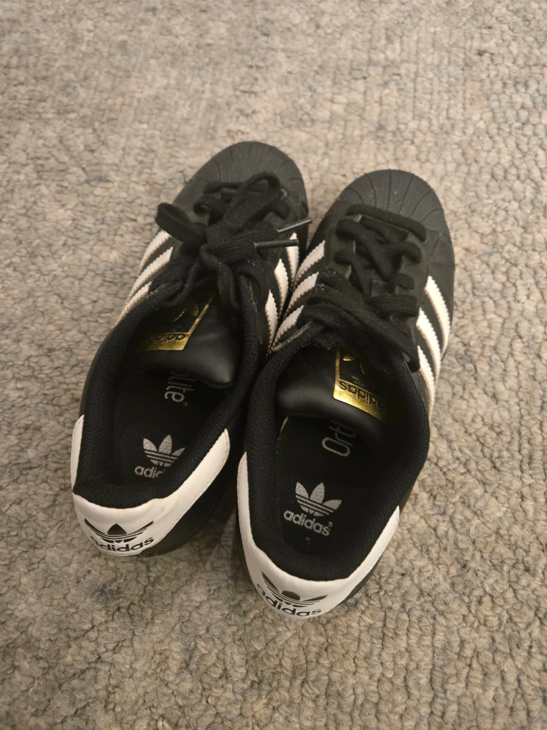 Classic Adidas Superstar sneakers in black with white stripes. Features OrthoLite sockliner for comfort and durable rubber shell toe. Made in Indonesia. Size is US 4.5., EUR 36.5 . Fits me, I'm a size 5-6