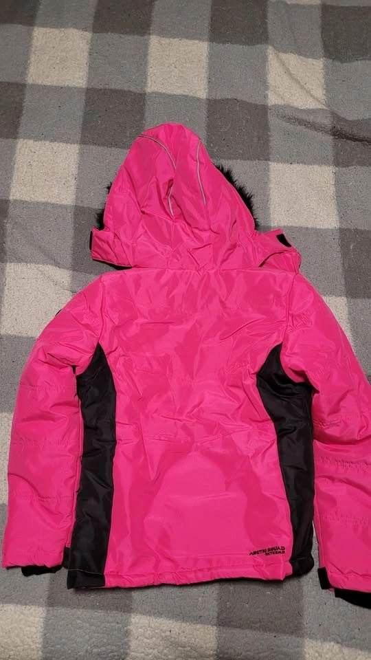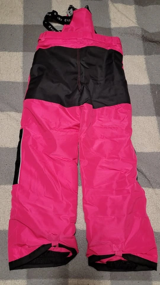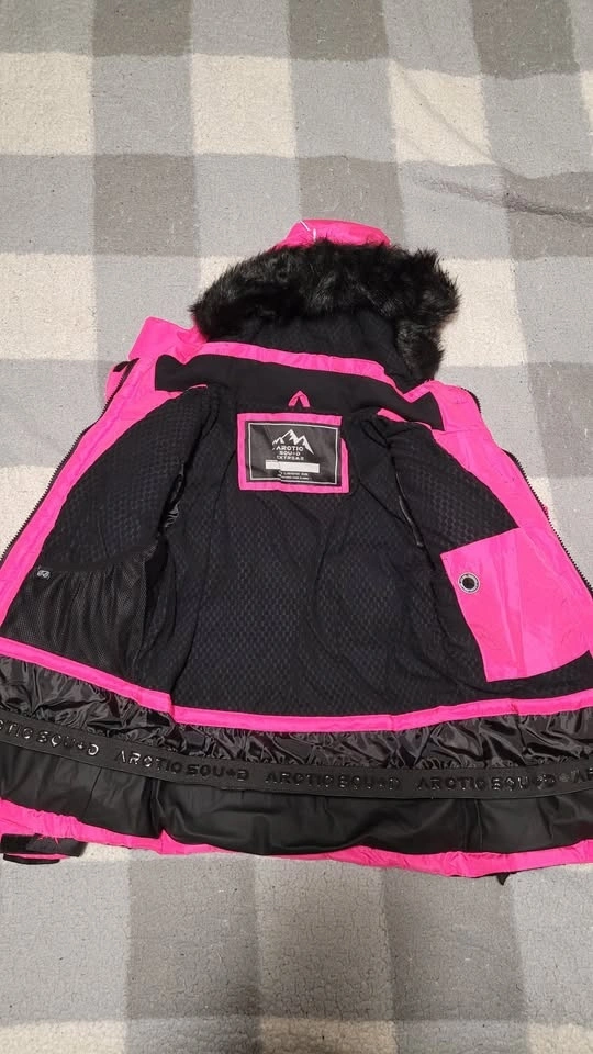 This high-quality snowsuit was worn only ONCE and is in new condition. It features a stylish pink and black design, offering both functionality and fashion for winter activities. The jacket includes a fleece-lined hood, long sleeves with storm cuffs and adjustable Velcro, and a full-zip closure for optimal warmth and protection. The pants are designed with reinforced knees for durability. Perfect for keeping your child warm and comfortable during cold weather. Available for pickup.