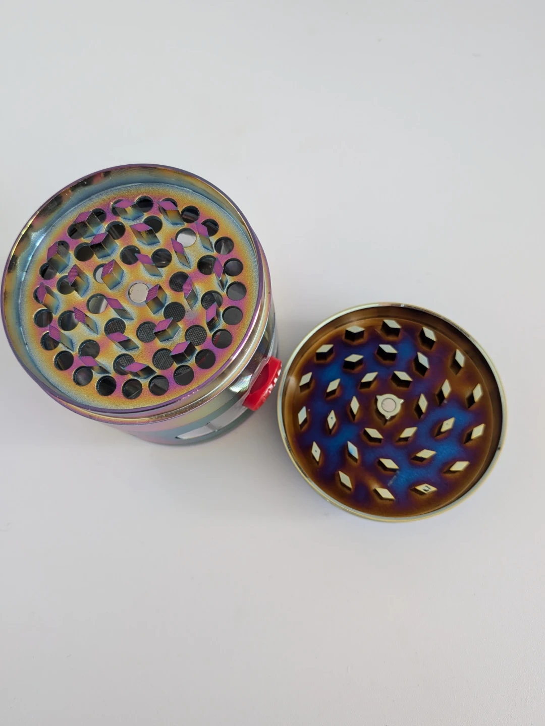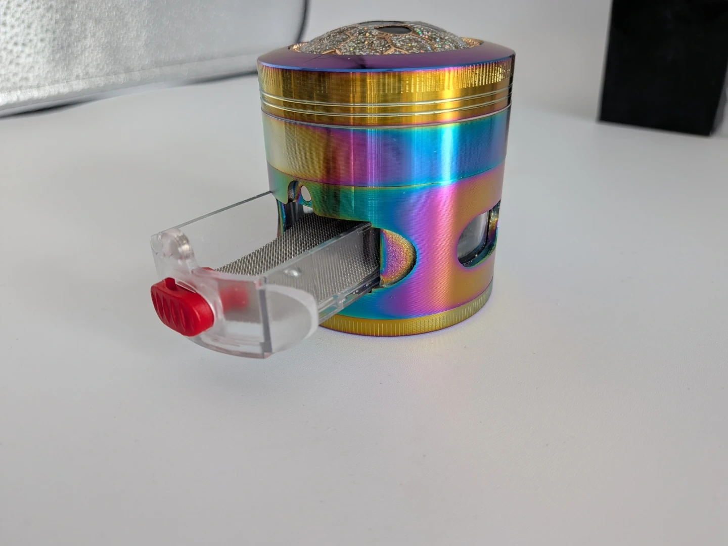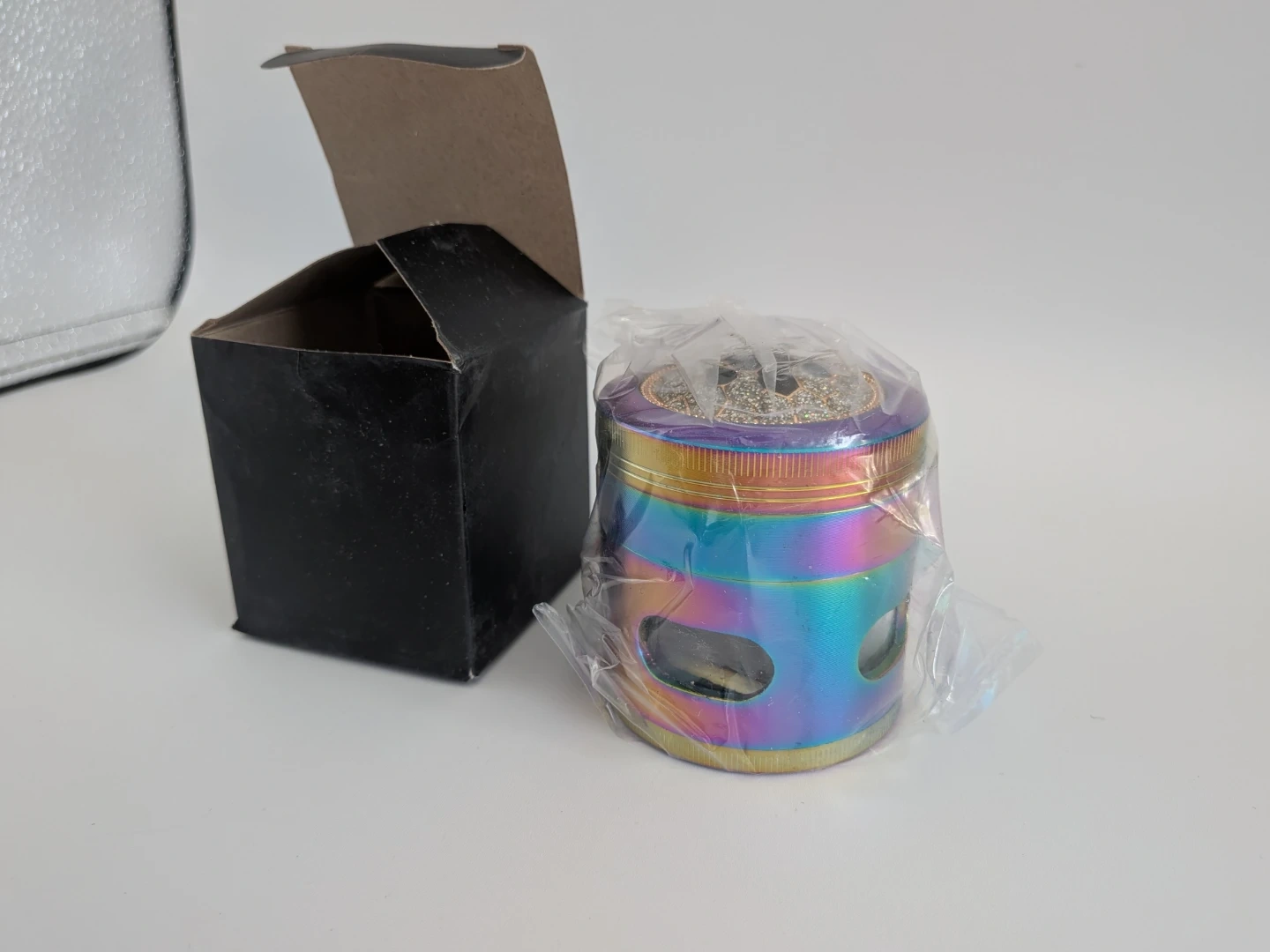 This four-piece herb grinder features a rainbow metallic finish and sharp, durable teeth for efficient grinding. It includes a built-in collection tray to catch fine particles and a mesh screen. The grinder comes in its original box.
