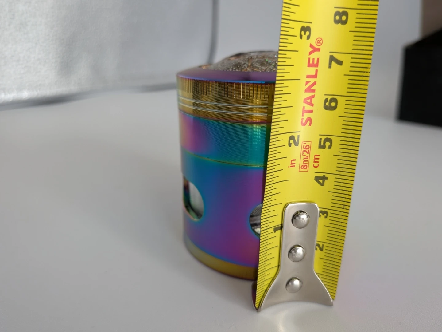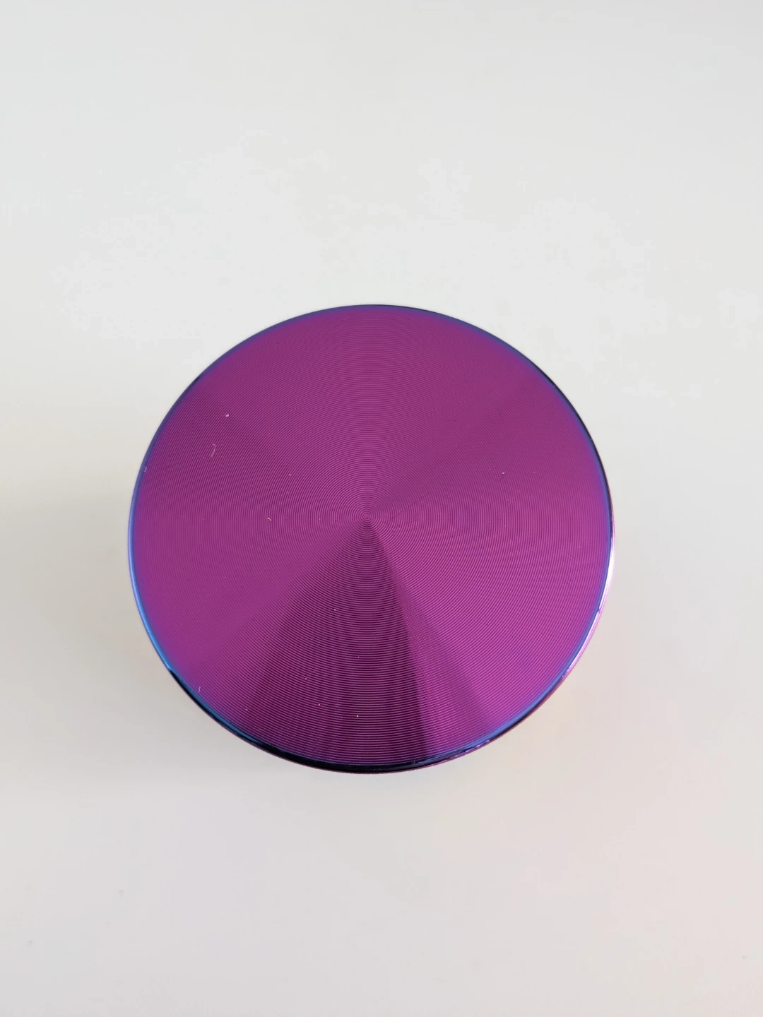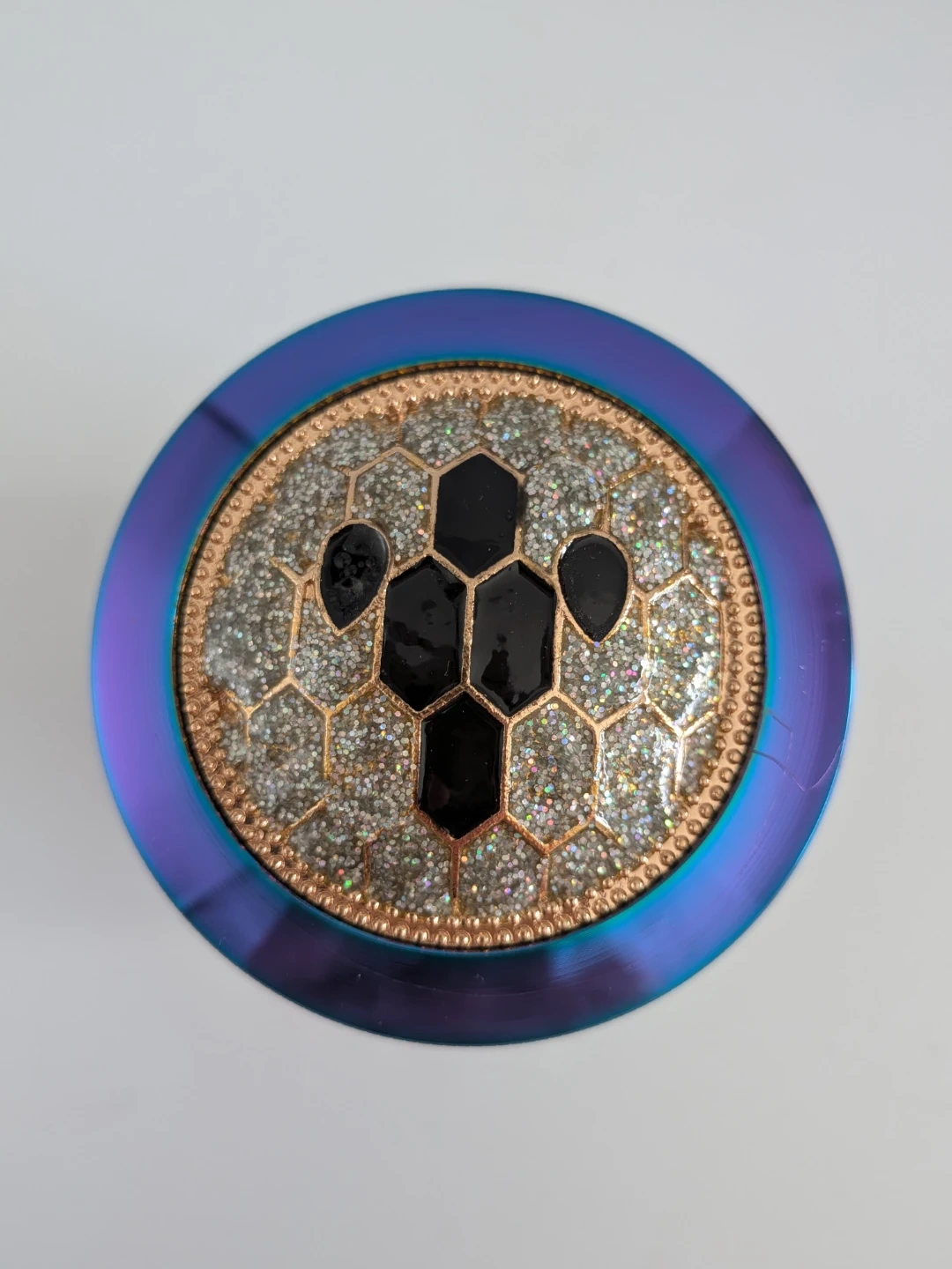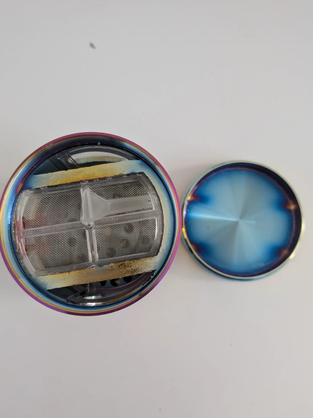 This four-piece herb grinder features a rainbow metallic finish and sharp, durable teeth for efficient grinding. It includes a built-in collection tray to catch fine particles and a mesh screen. The grinder comes in its original box.