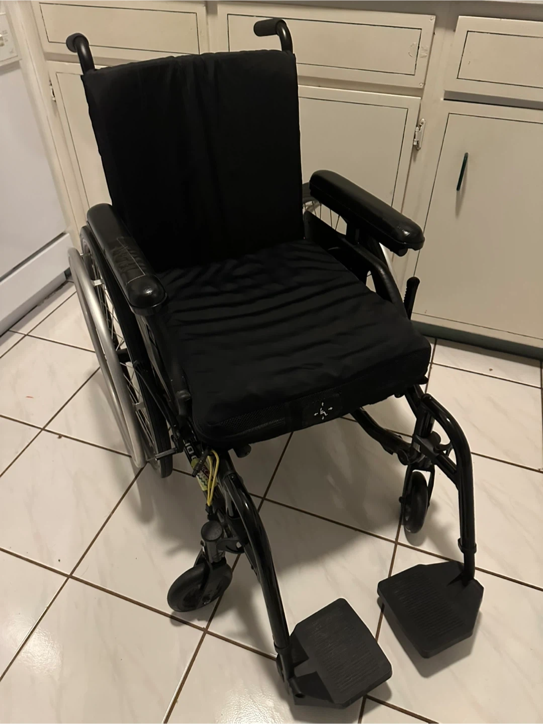 This is a black Motion Composites wheelchair. It's in used condition with some wear on the armrests. It features large rear wheels and smaller front casters.