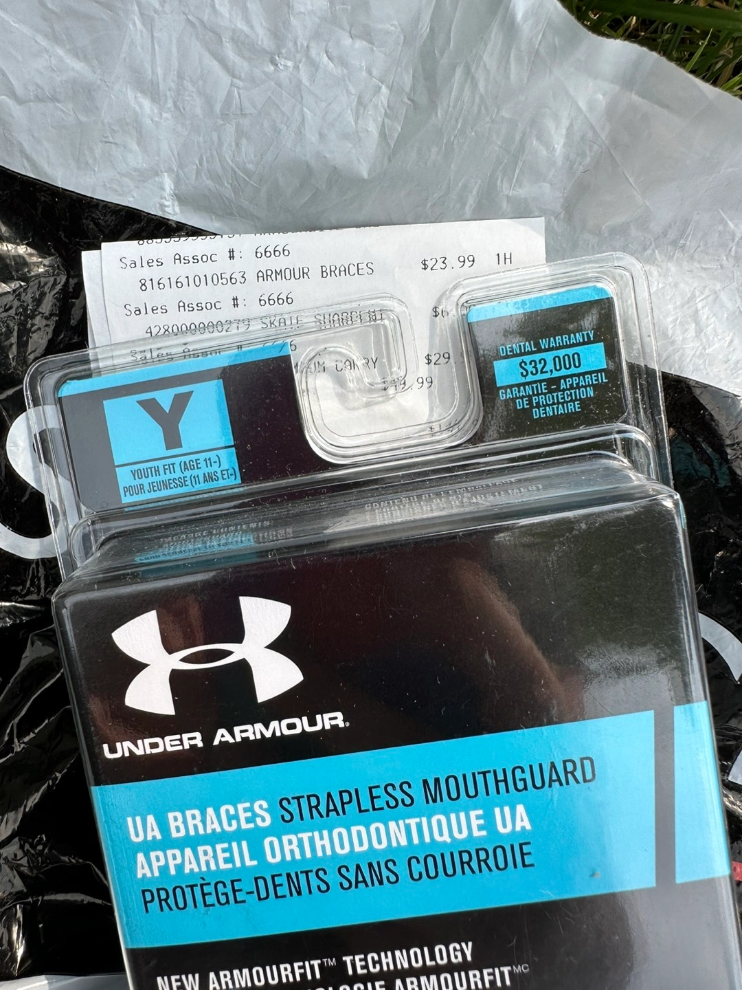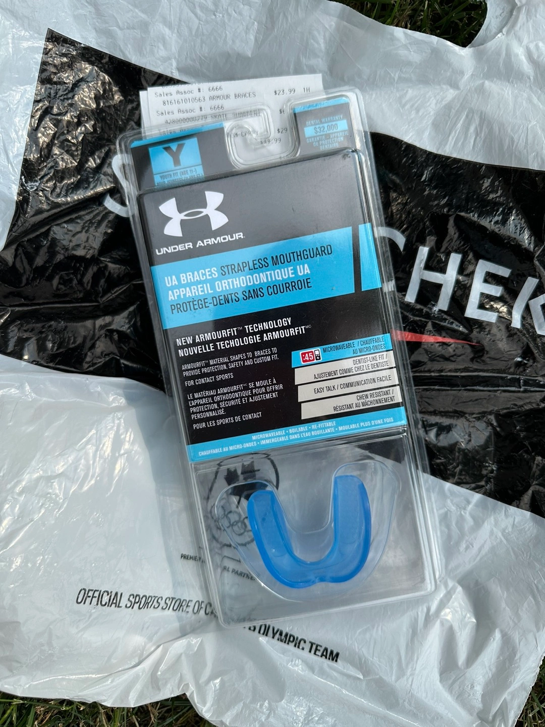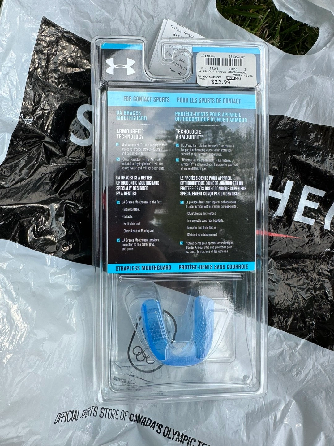 Under Armour Armourbraces has a patented ArmourFit Material that shapes to braces to provide protection, safety and a custom fit. The ArmourFit material is hydrophobic. It will not absorb water and will not deteriorate. The Under Armour Braces is a better orthodontic mouth guard that is specially designed by a doctor. The Under Armour Braces Mouth Guard is the first microwaveable, boilable, re-fittable and chew resistant mouth guard designed specifically for braces. This mouth guard was designed for competition in all contact sports.