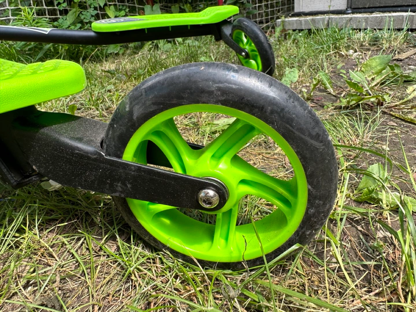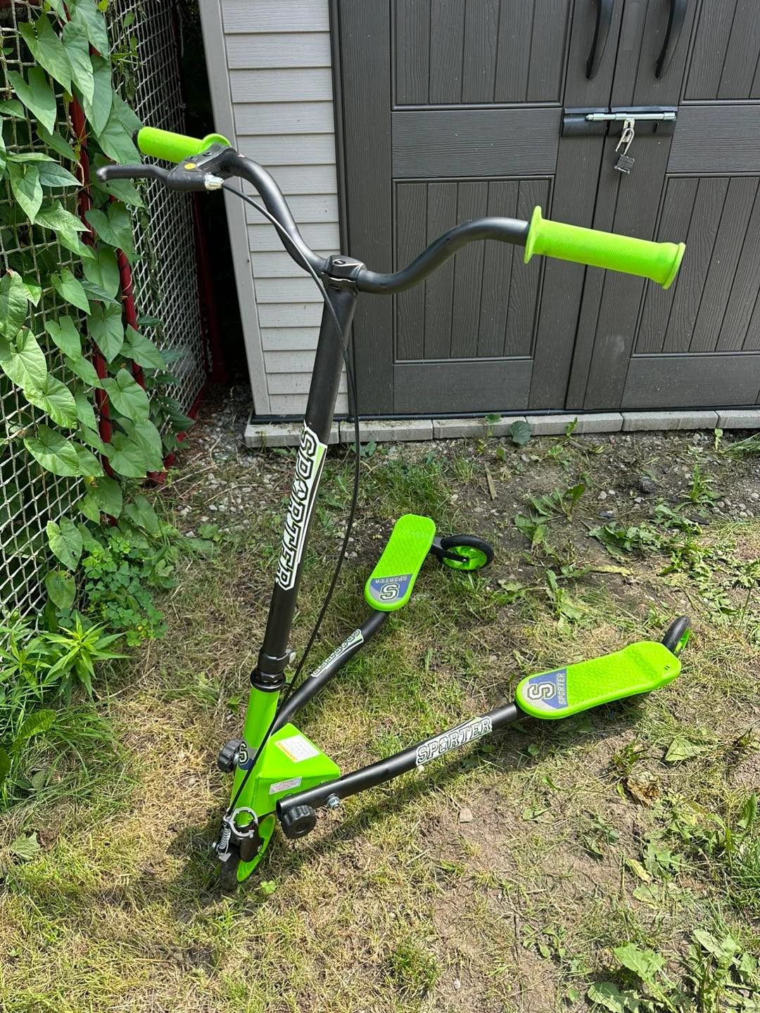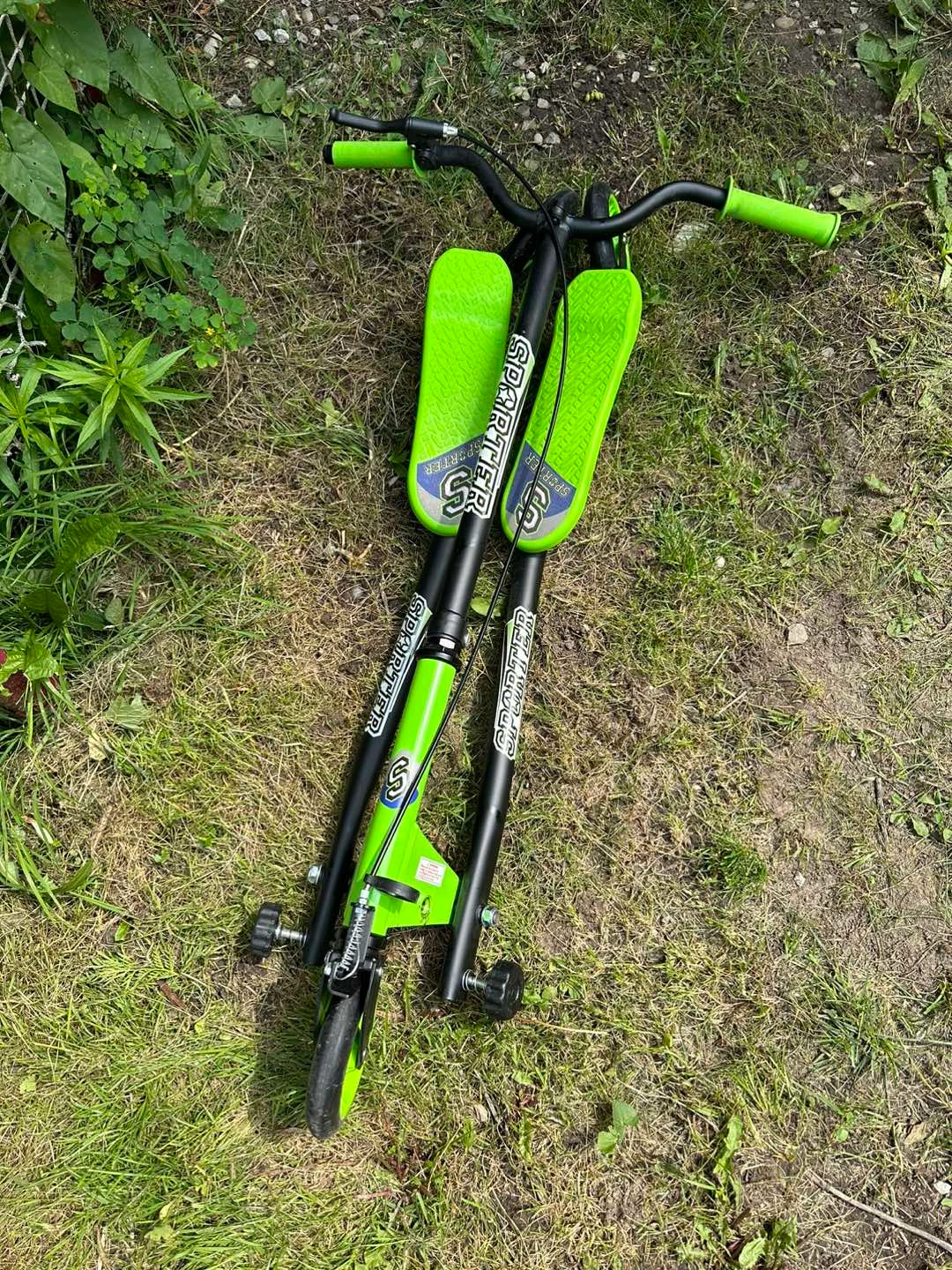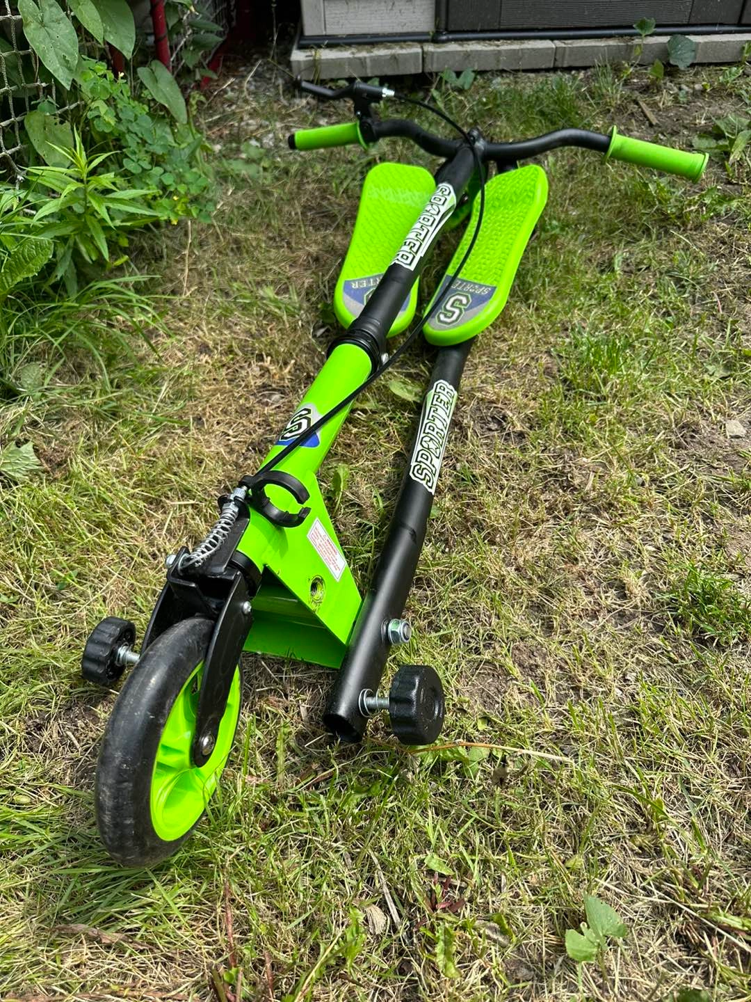 EUC https://www.mastermindtoys.com/collections/sporter-scooters-by-mastermind-toys/products/sporter-xl-145mm-scooter-green This funky scooter is 100-percent kid-powered and yet their feet don't even touch the ground. Riders shift their weight side to side to create forward momentum and use the handbrake to manage their speed and even power-slide around tight corners! * Quick-fold design for easy storage and transport * Three tough 145mm wheels for stability * Large textured foot beds provide great grip * Weight limit of 220 lbs One handlebar grip is slightly damaged as seen in photo. Pick up near Victoria Park & Ellesmere. X-posted.