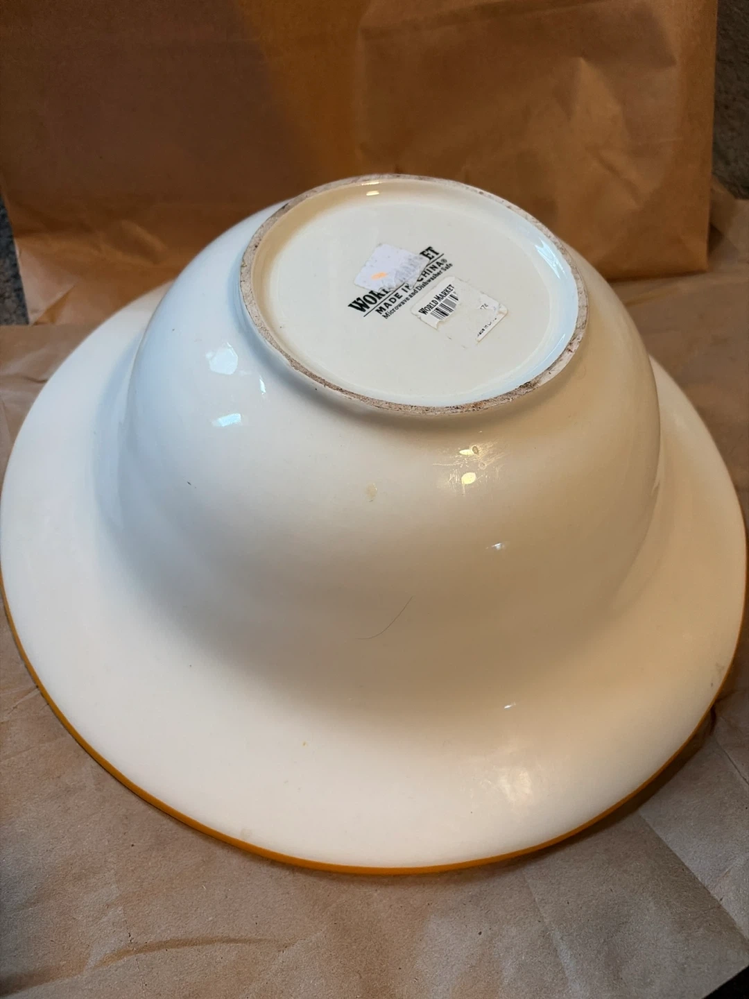 This is a large serving bowl. It's white with a decorative blue and yellow rim pattern. Microwave and dishwasher safe