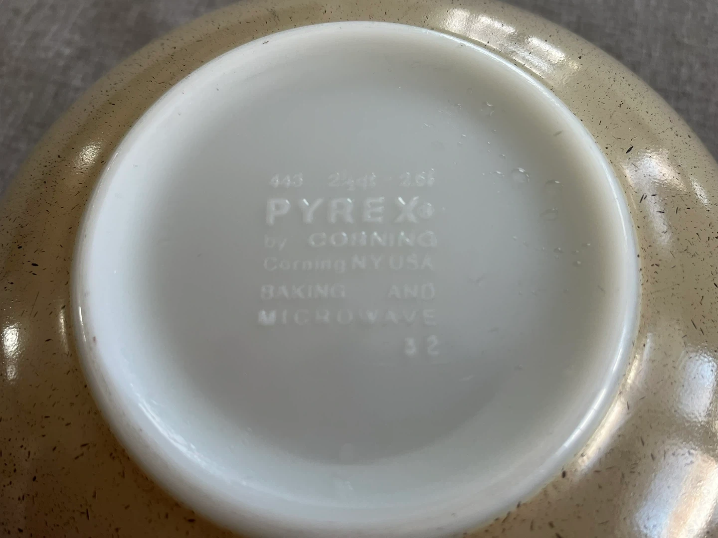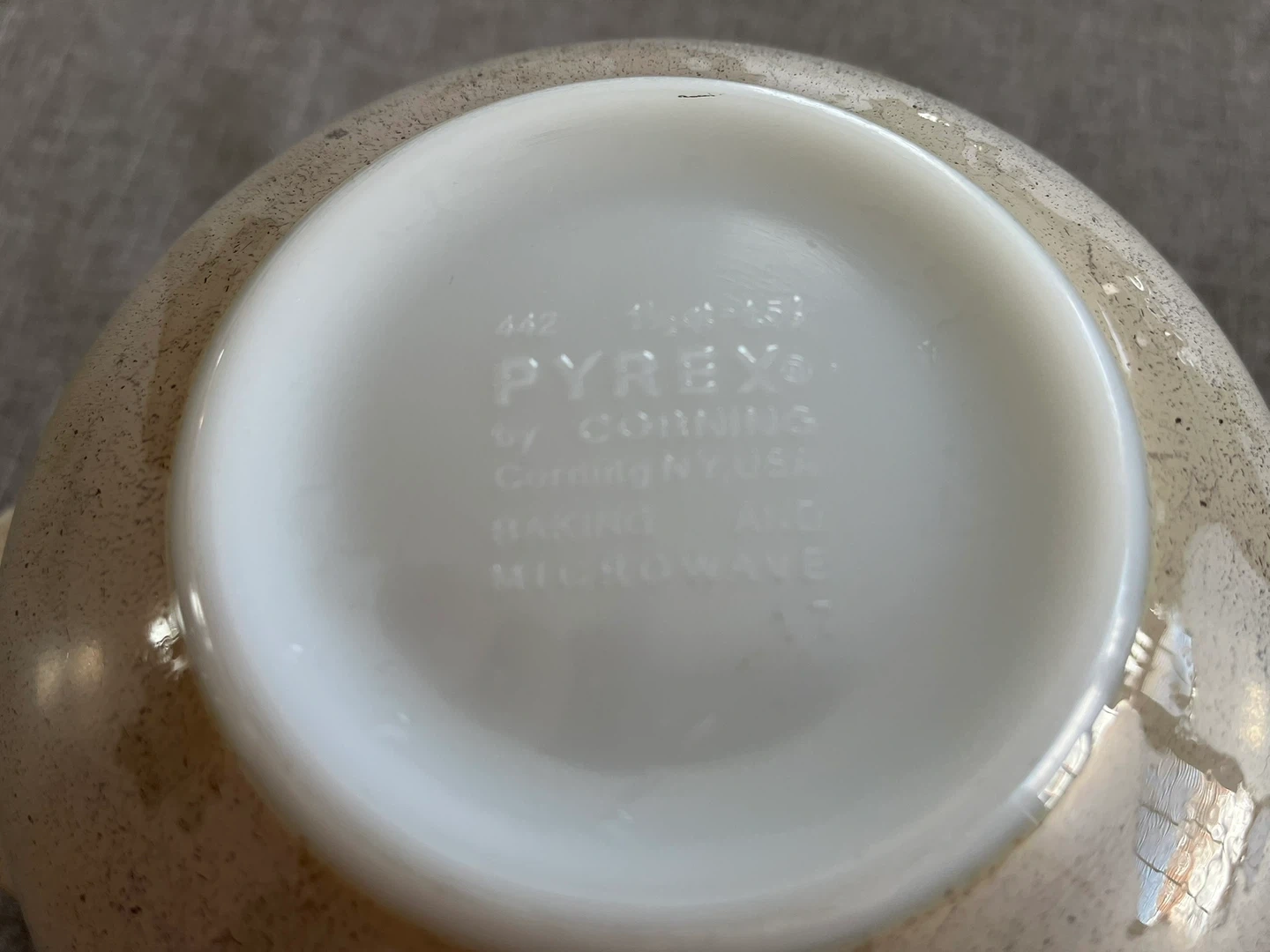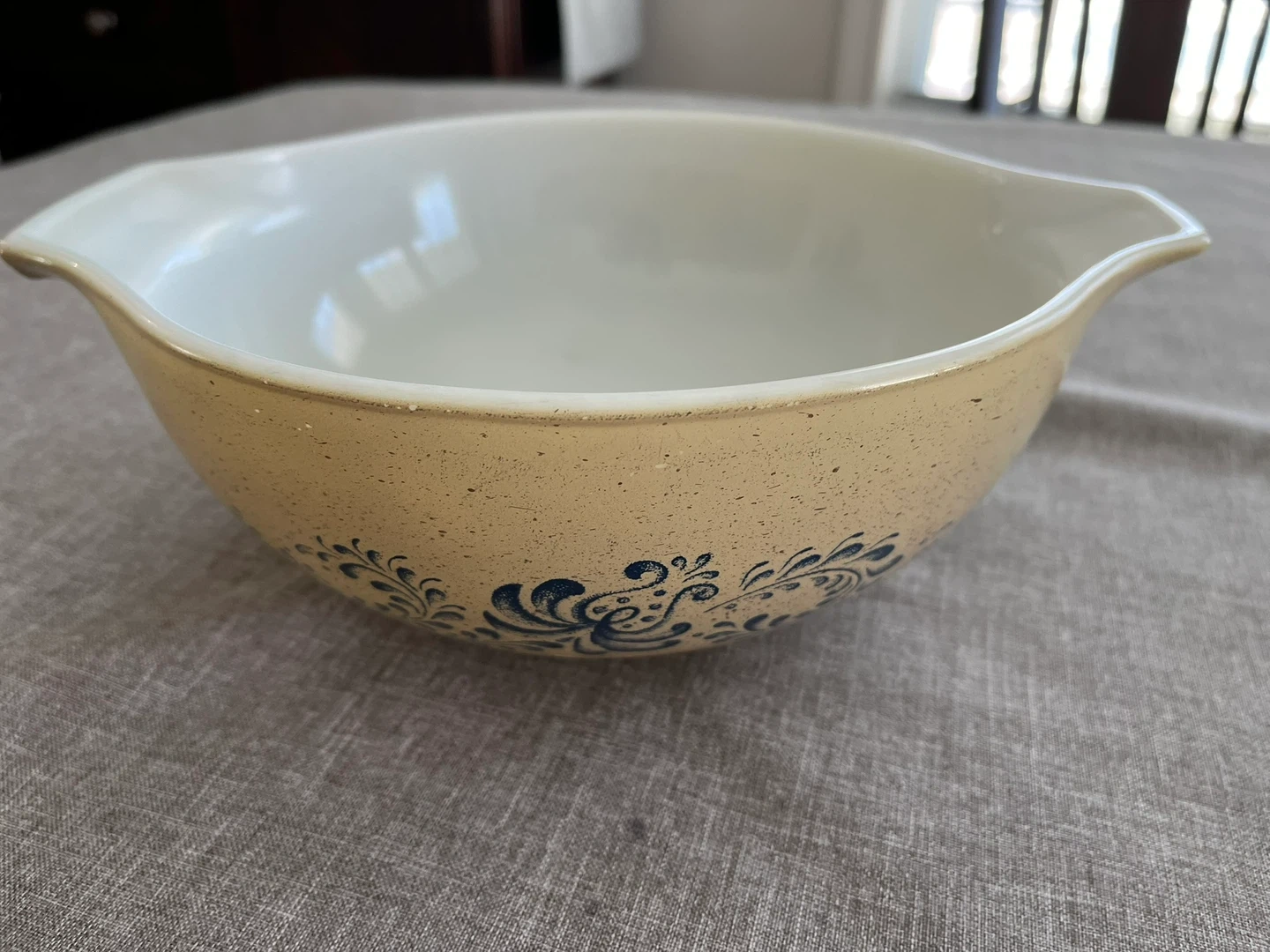 Set of 2 Vintage PYREX Homestead Cinderella Mixing bowls with Blue Floral pattern. These are beautiful, tempered glass mixing bowls with a speckled, almond beige Colour with stunning blue floral homestead pattern scrollwork detail on the sides. Sizes # 442 - 1.5 quart and # 443 - 2.5 quart. Can be used for baking and microwave.
