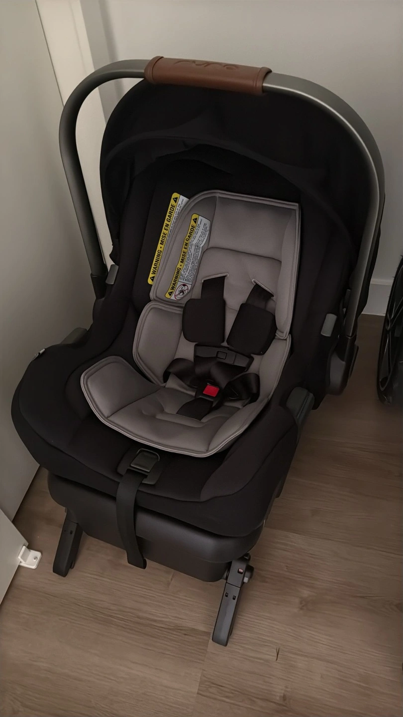 This Nuna Pipa infant car seat is black with grey padding. It features a five-point harness and a leatherette handle. It's designed for infants and includes a base.