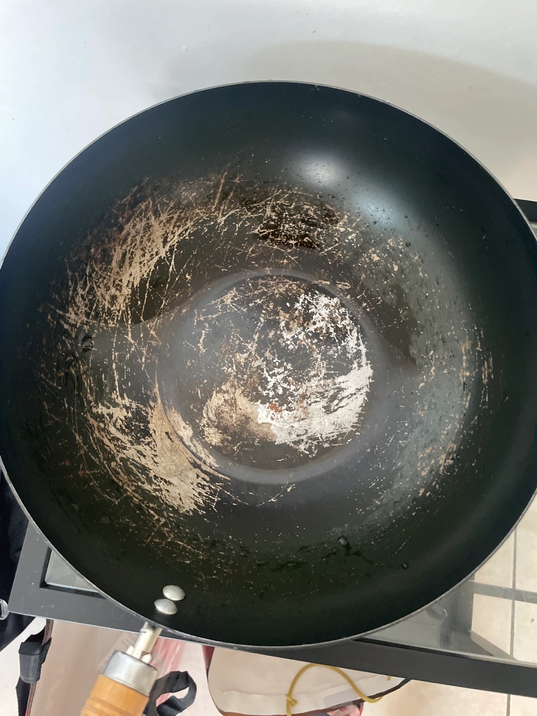 This is a black iron wok with a glass lid and a wooden handle. It shows signs of use inside and has several scratches that RUST since its iron, but it's still functional for cooking. It's suitable for stir-frying and other Asian-style dishes.