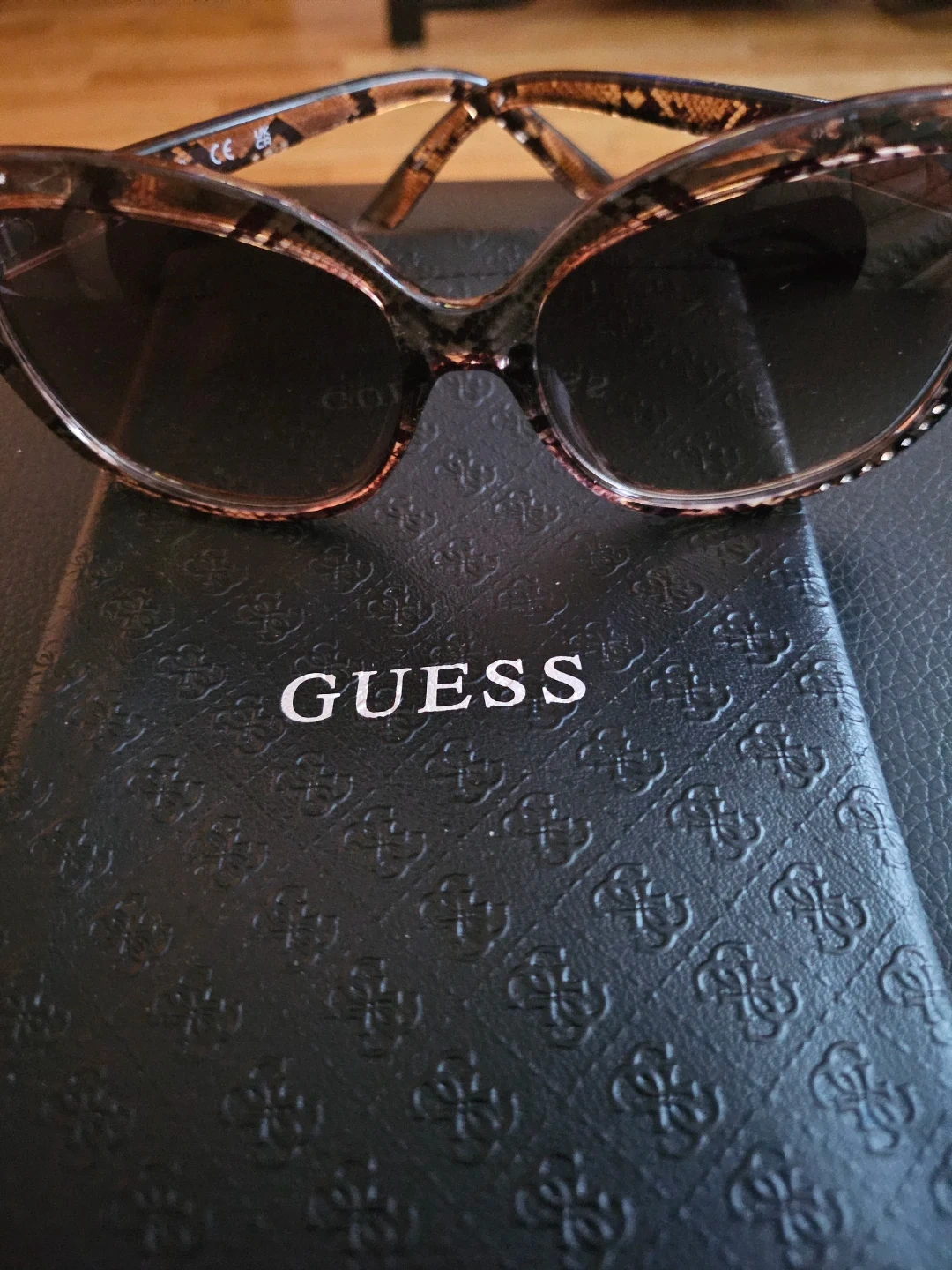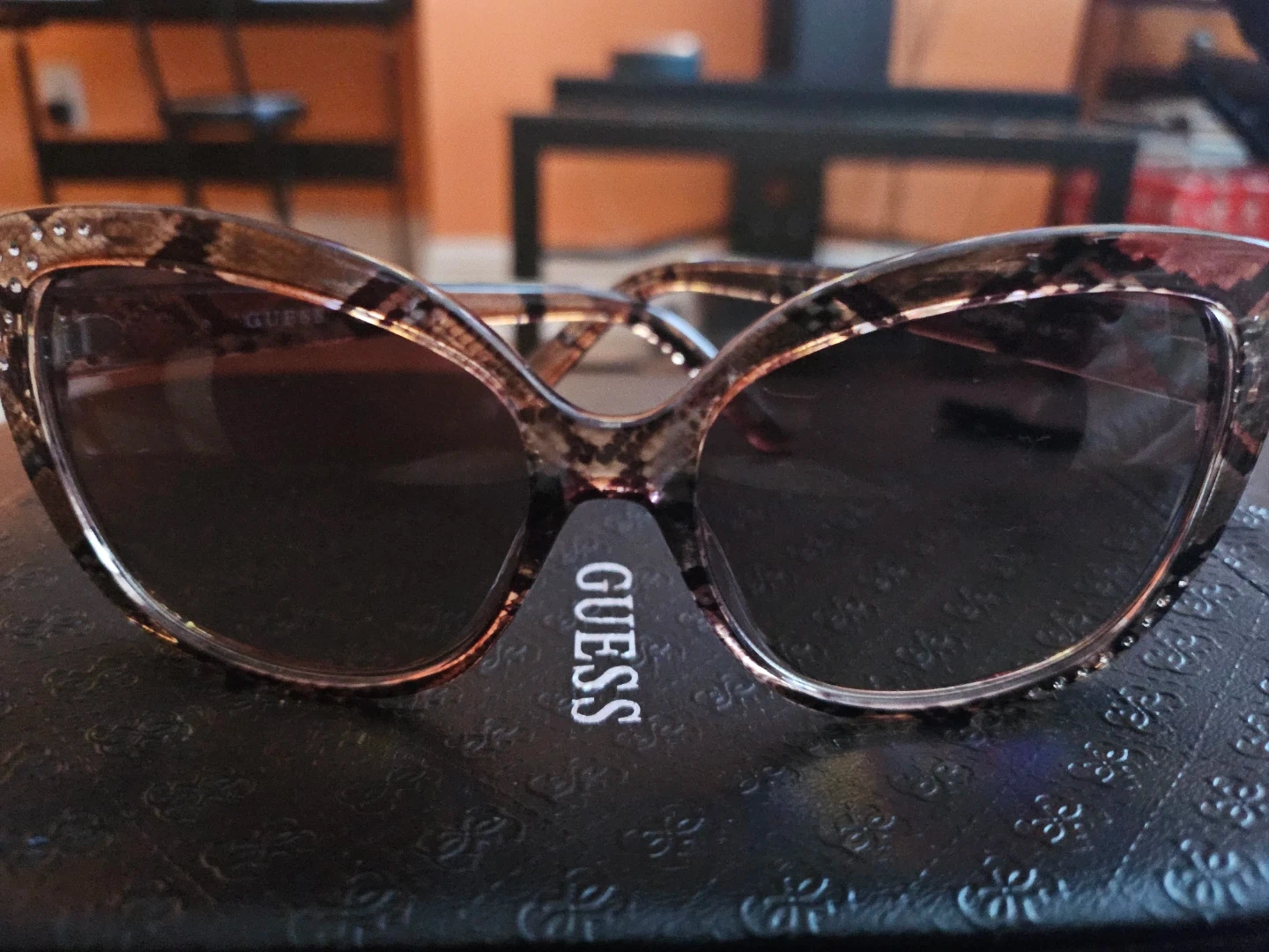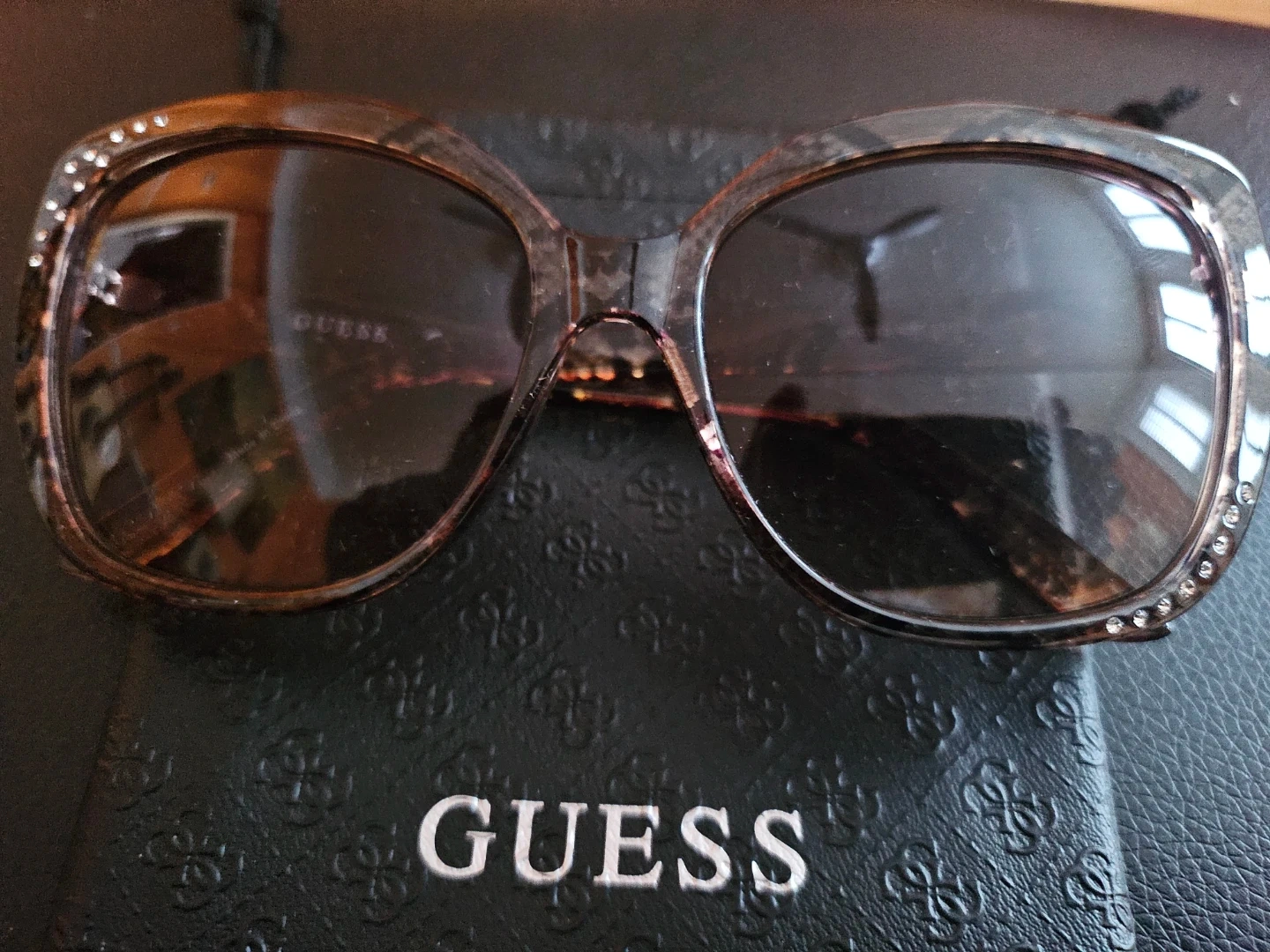 These stylish Guess cat-eye sunglasses feature a brown tortoise shell pattern with decorative rhinestones on the frames. They come with a protective Guess pouch. Perfect for adding a chic touch to any outfit!