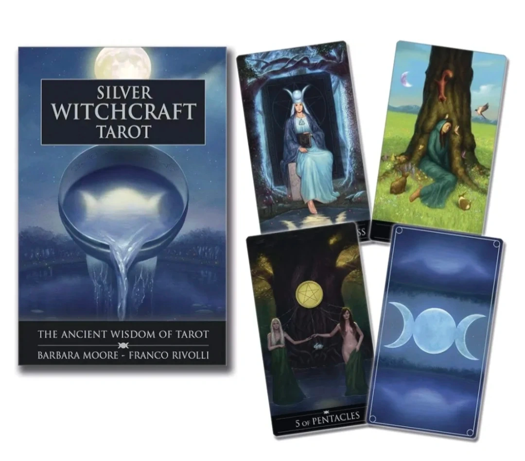 This is the Silver Witchcraft Tarot deck by Barbara Moore and Franco Rivolli. It includes a 78-card Tarot deck and a 160-page colour book. Use the cards and book for divination and connecting with the Divine.