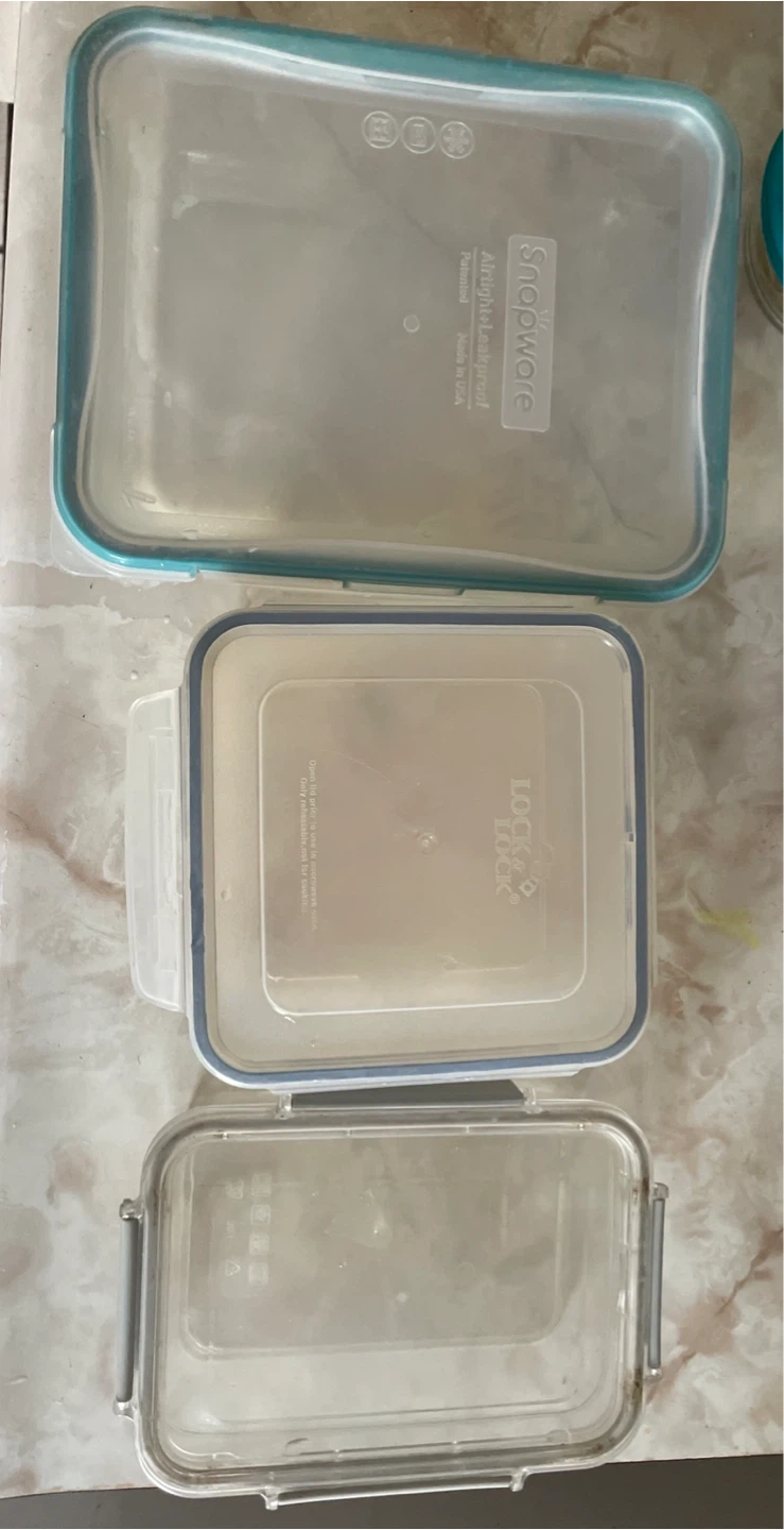 Three food storage containers, two Lock & Lock and one Snapware. They're made of plastic and glass with secure lids. Useful for storing leftovers or packing lunches!