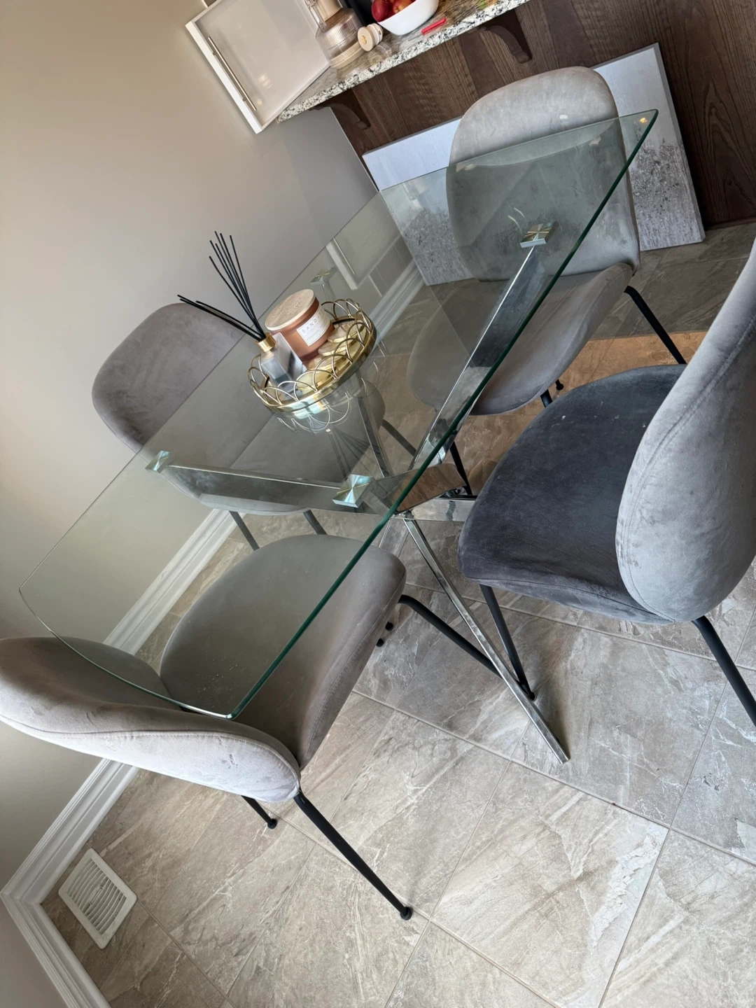 Modern dining set featuring a clear glass tabletop with a chrome base. Comes with four comfortable grey velvet chairs, each with black metal legs. This set offers a sleek look for your dining space.