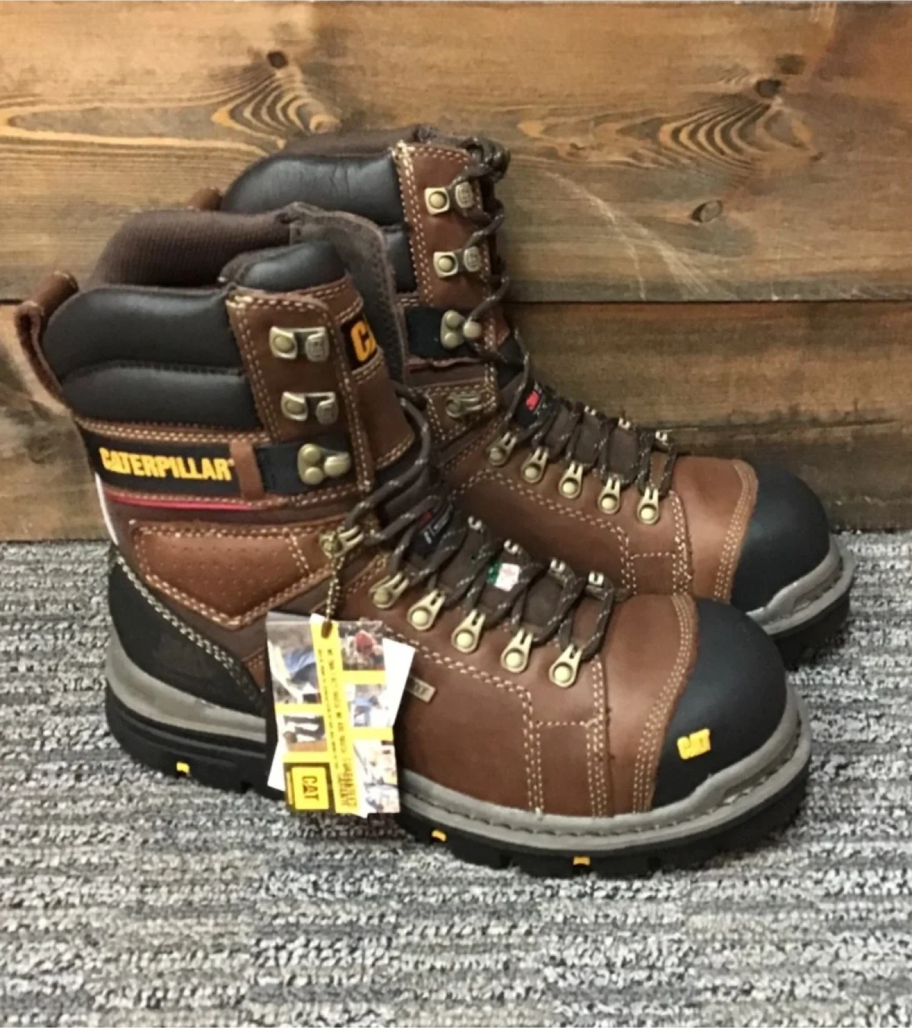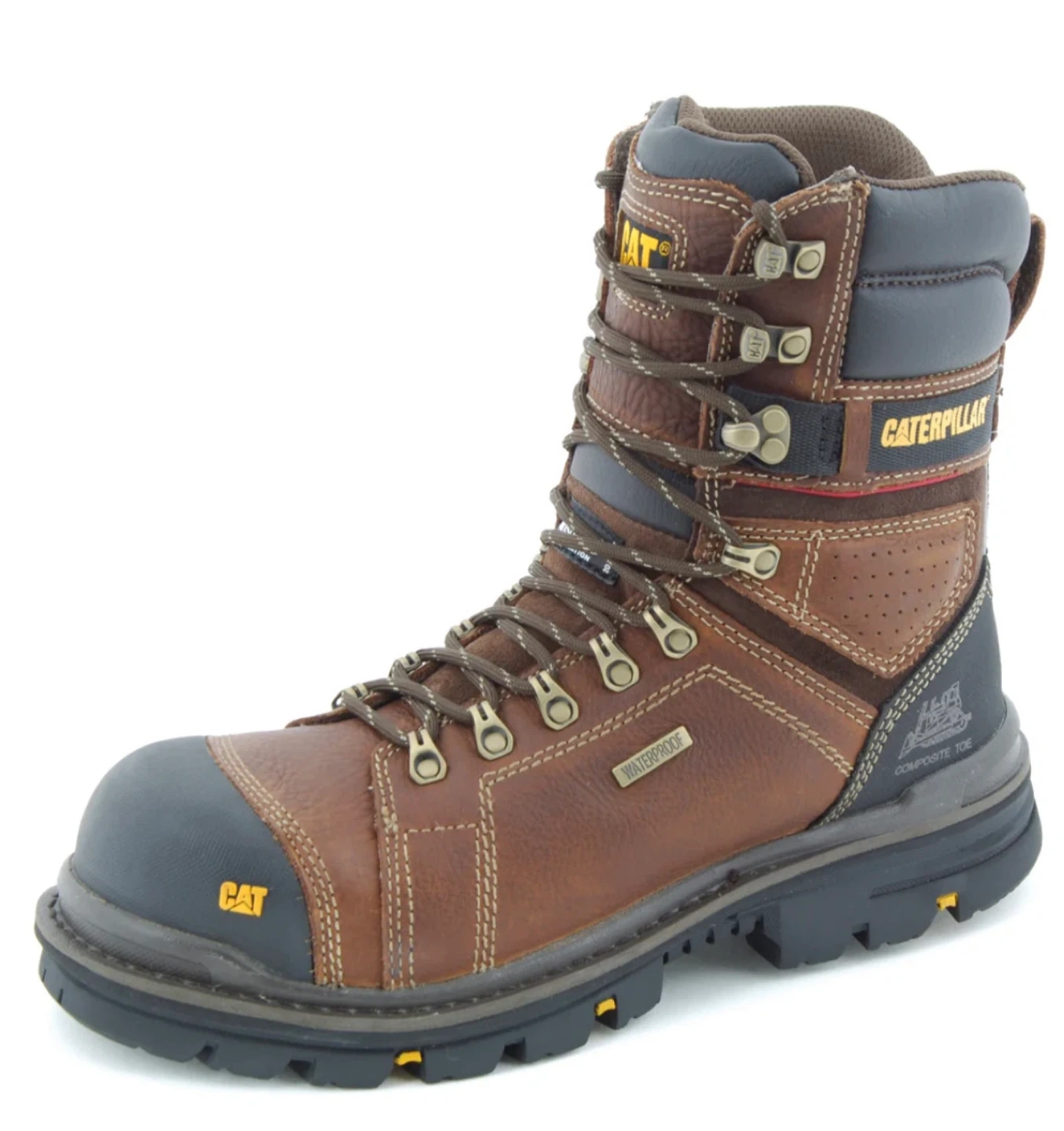 These Caterpillar work boots offer a composite toe for protection. They're waterproof to keep your feet dry. Rugged and durable for tough jobs!