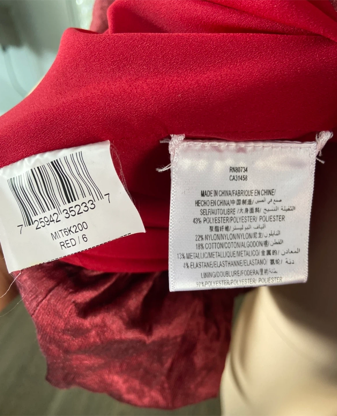 NWOT BCBG Max Azria Red Metallic Shirred One-Shoulder Above Knee Ruched Bubble Hem Lined Chiffon Cocktail Dress (Size 6)