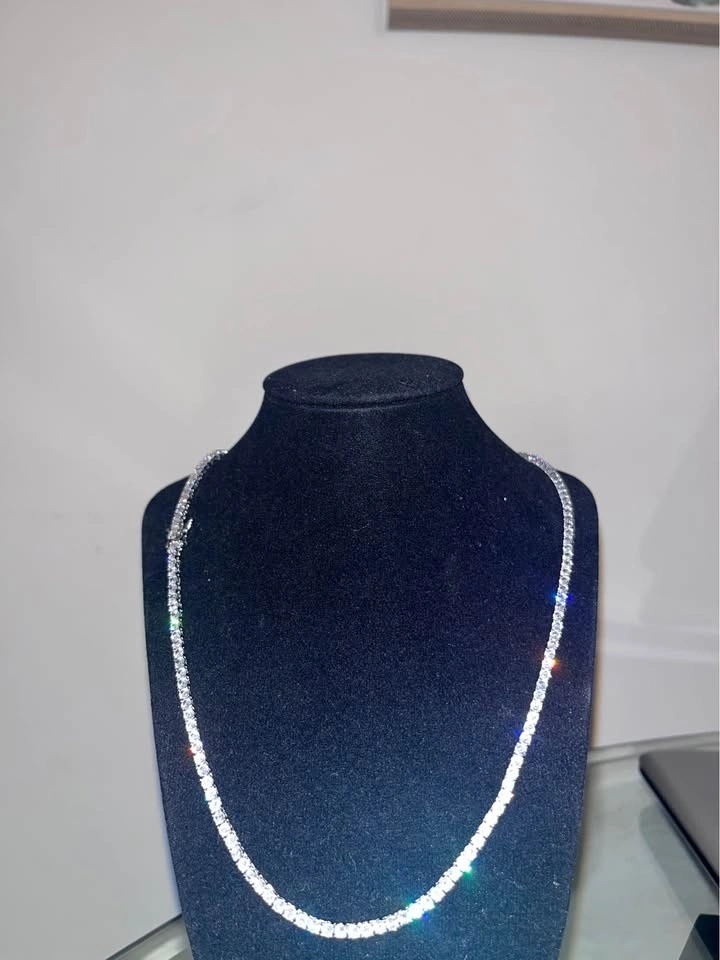 High-quality tennis chain, available in 22-inch and 24-inch lengths, 3mm width. Features VVS CZ simulated stones with a diamond-like shine. Made from stainless steel that won't rust or fade. It's hypoallergenic and safe for daily wear, with premium shine and excellent craftsmanship. Perfect for everyday wear or special occasions. Looks luxurious and eye-catching, matching any outfit. Message me for more details or pictures.