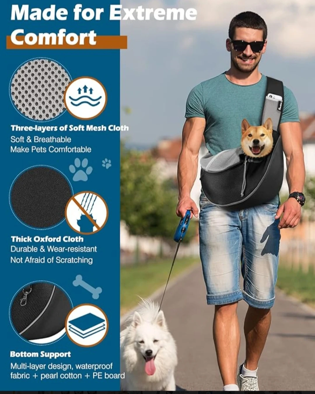 This pet carrier sling bag is made from three-layer soft mesh cloth and thick Oxford cloth for durability and breathability. It features a comfortable shoulder strap with an adjustable buckle and a built-in safety strap to keep your pet secure. The opening mouth's tightness can be adjusted with a drawstring. It's suitable for small to medium pets.