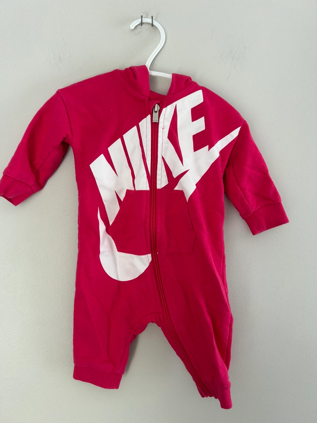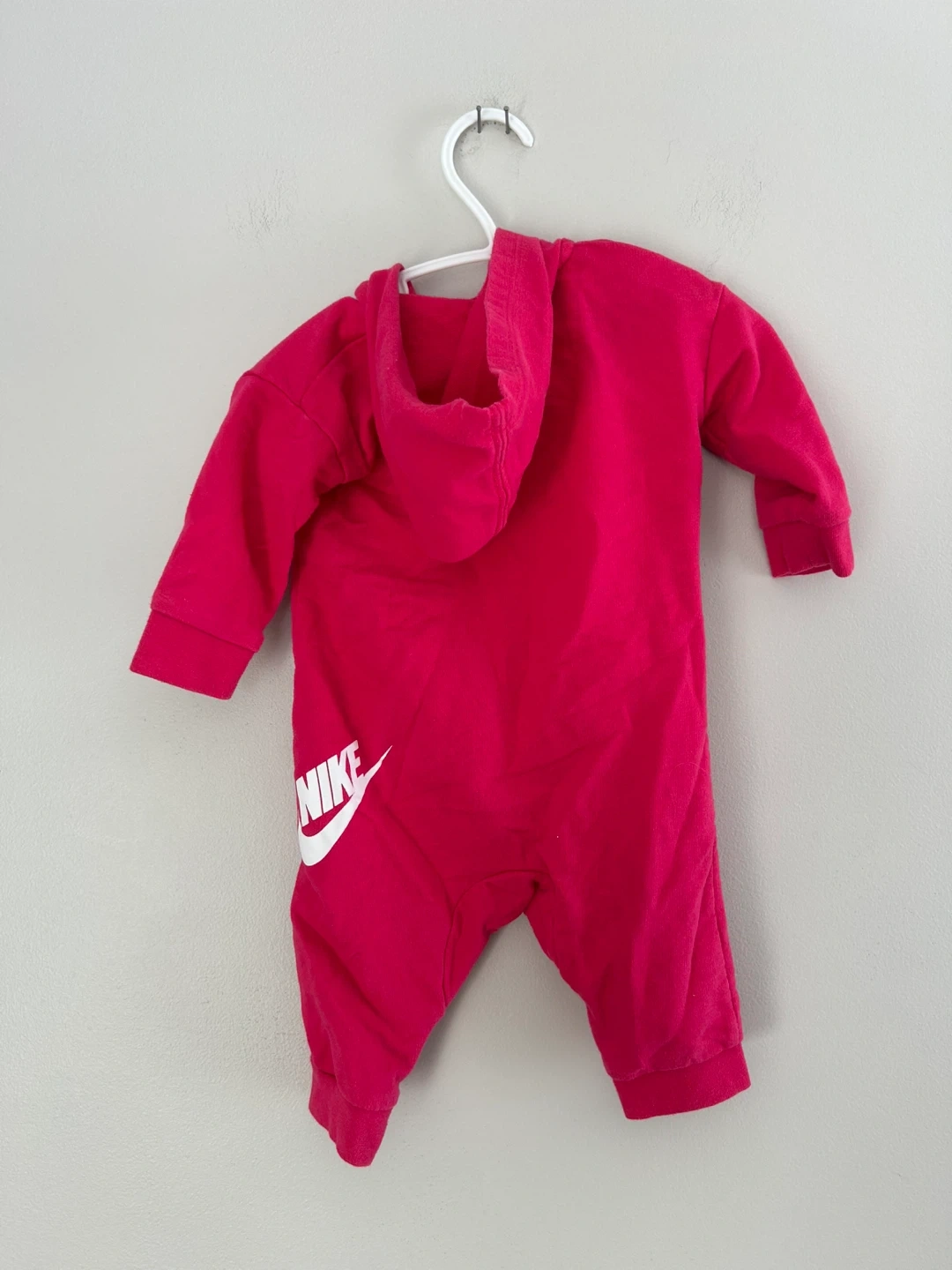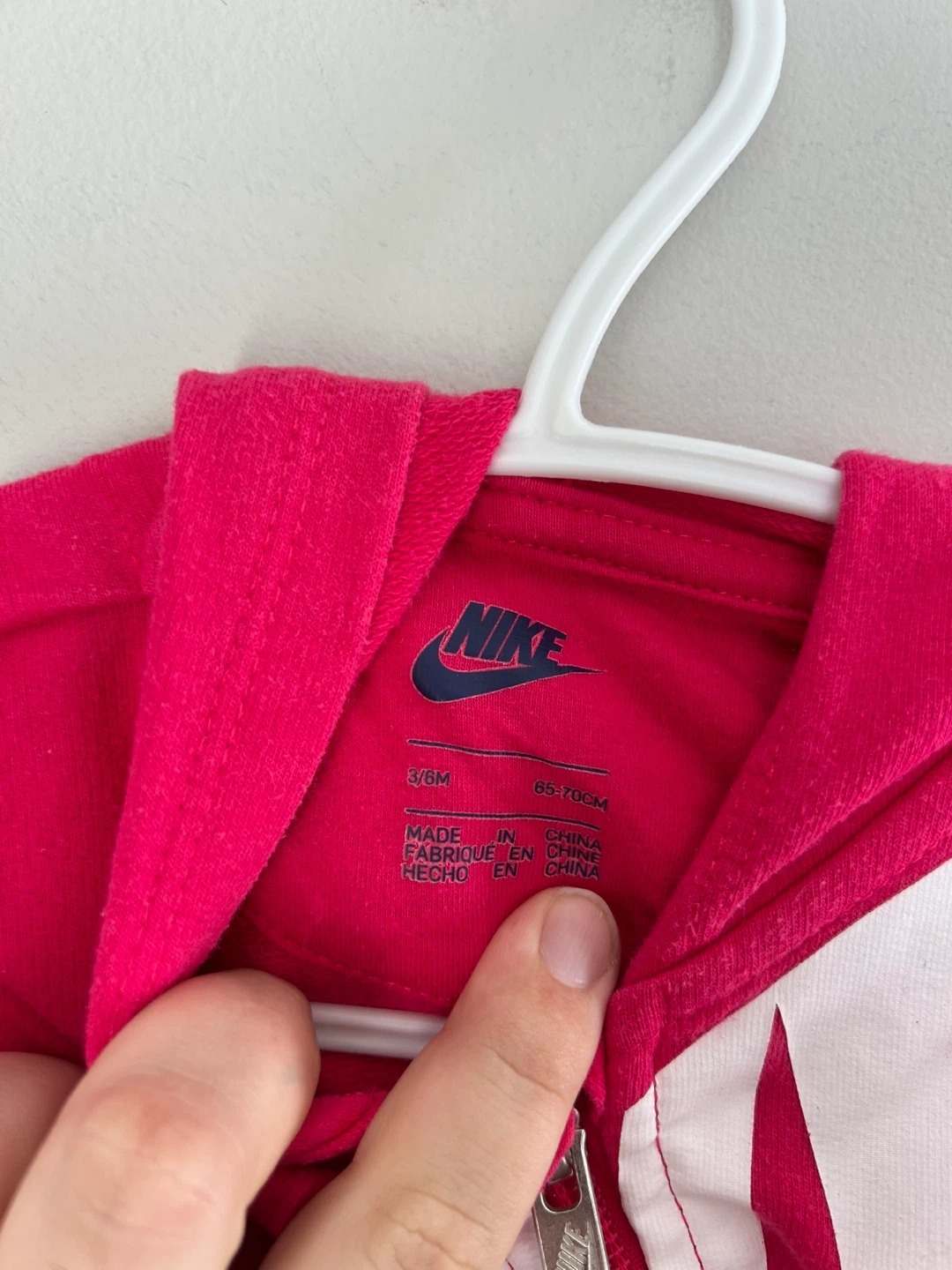 Nike brand. Zip up hooded sweater romper. Pink with white logo. Size 3/6m. Brand new condition