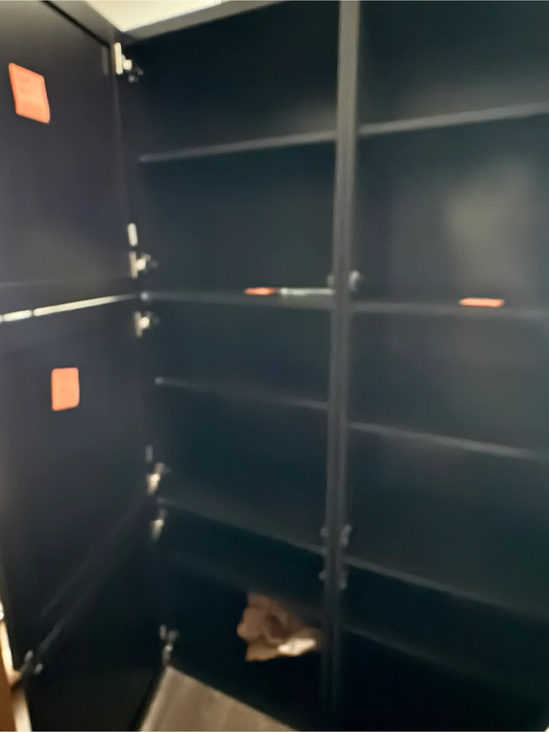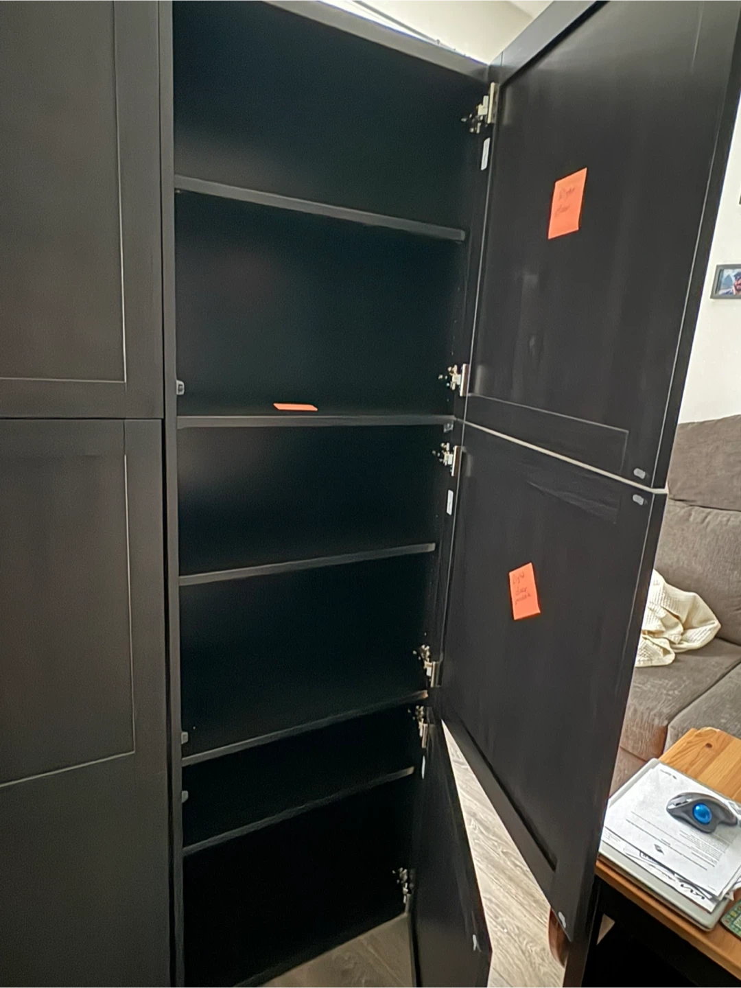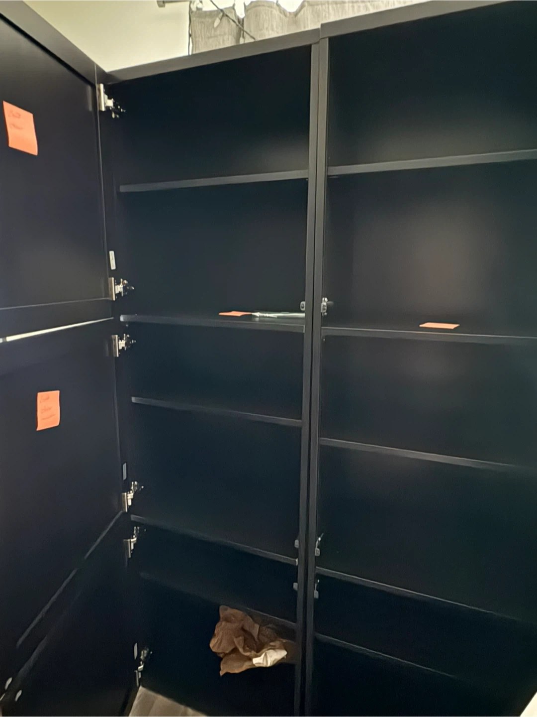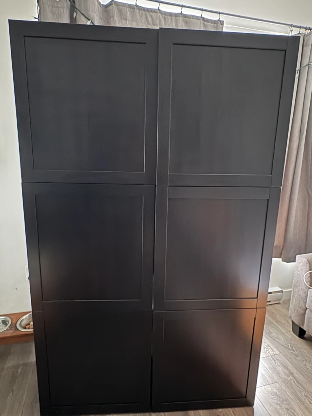 Double IKEA Besta black shelf unit with doors. 2 single units that have been mounted together according to IKEA instructions. Tall black storage cabinet with multiple shelves. Doors open to reveal ample storage space. It's perfect for organizing books, clothes, or household items. Made of durable material. Each single unit has the following measurements: 23 5/8 x 16 1/2 x 76 inches