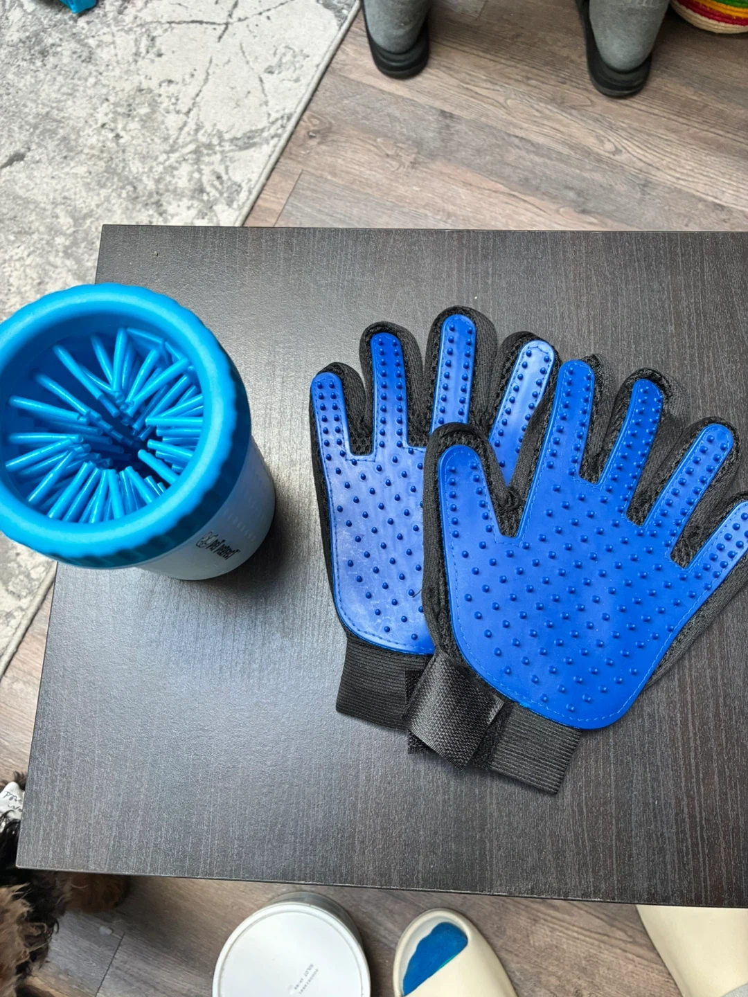 This set includes a pair of blue grooming gloves with nubs and a blue paw washer cup. The gloves help to loosen dirt and mud while bathing or brushing your pet. The paw washer is designed for easy cleaning of your pet's paws after walks. And fake glass