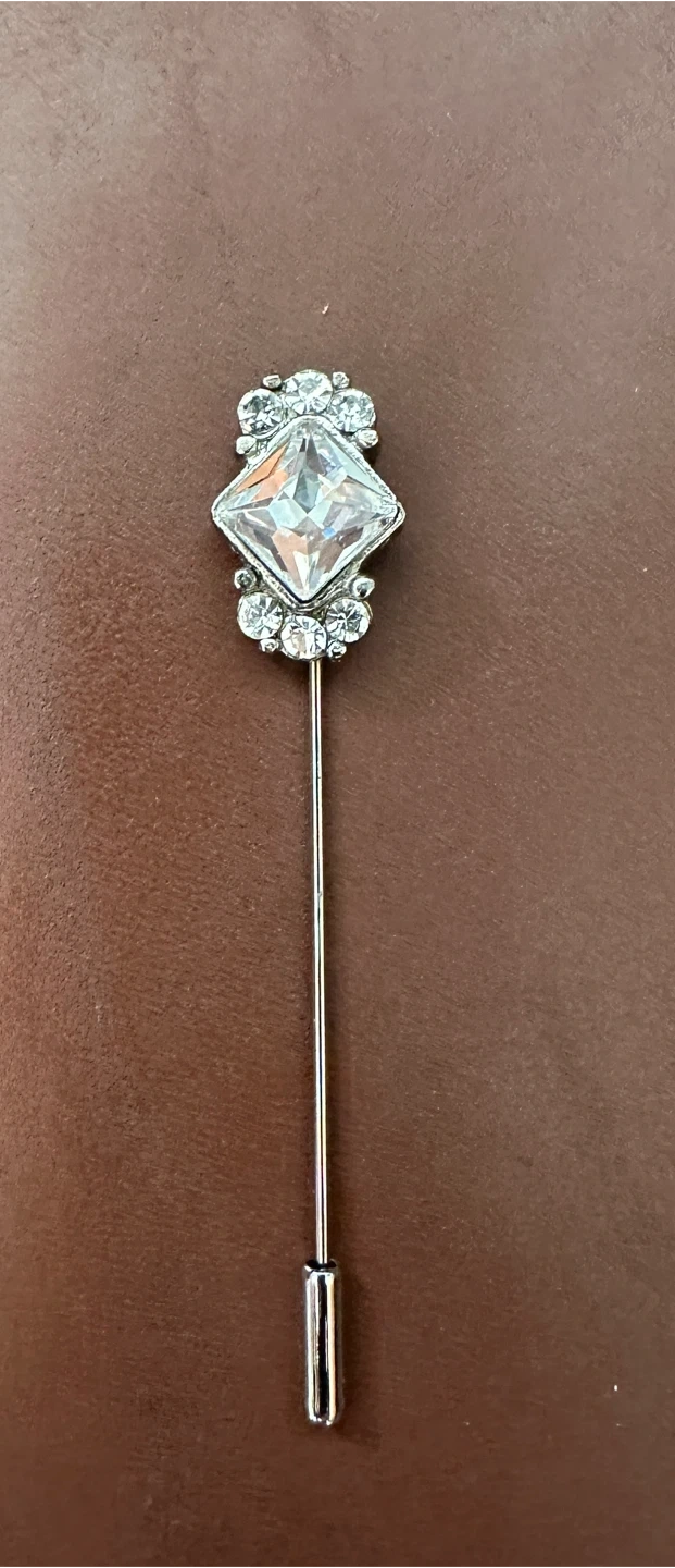 A sparkling lapel pin brooch featuring a large square rhinestone and smaller accent stones. It has a silver-tone metal finish. This pin adds a touch of elegance to any outfit. Great for formal wear or a stylish accent!