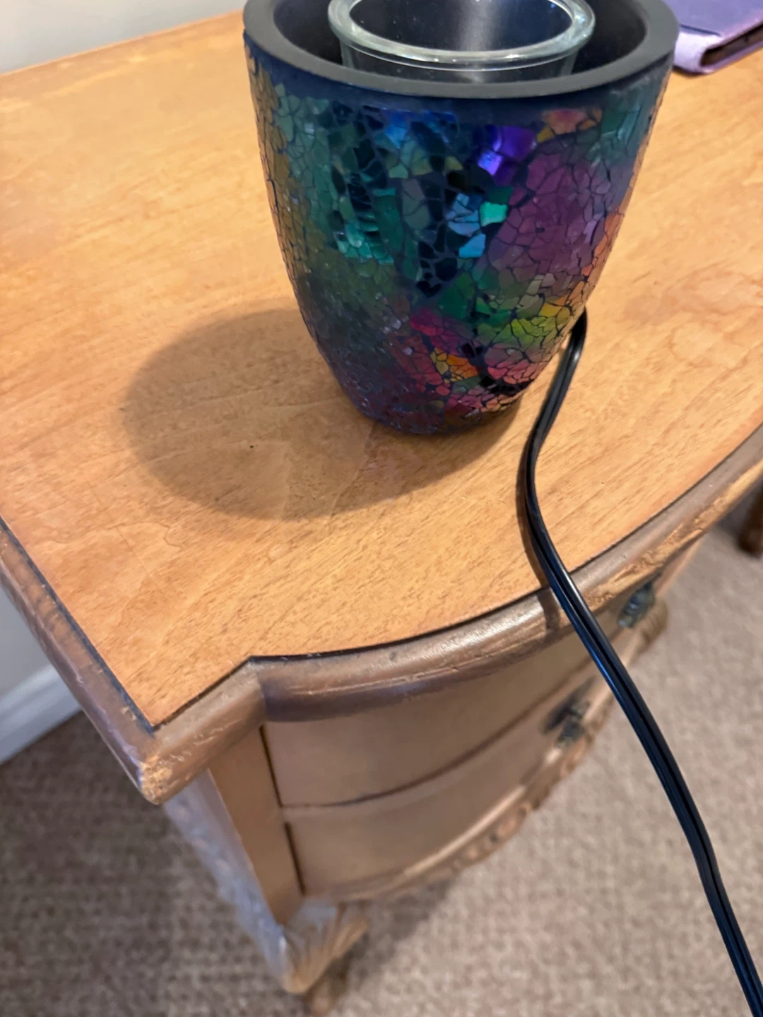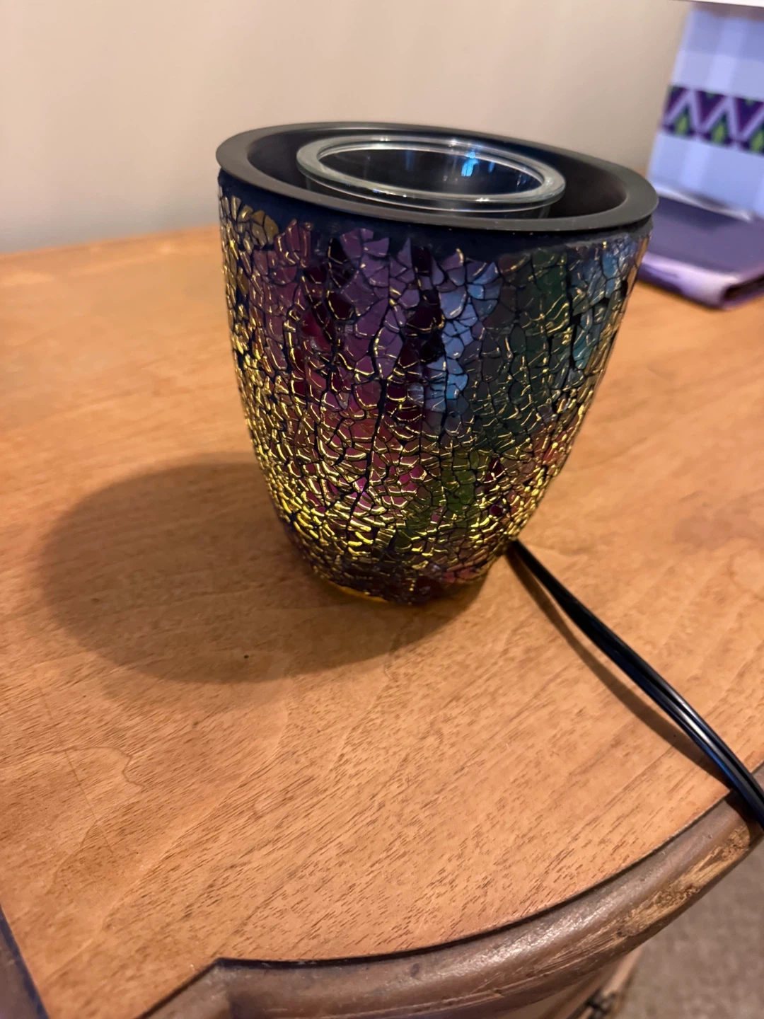 Mosaic glass electric tart warmer. It has a colourful, crackled mosaic design. The top dish holds your wax melts or essential oils.