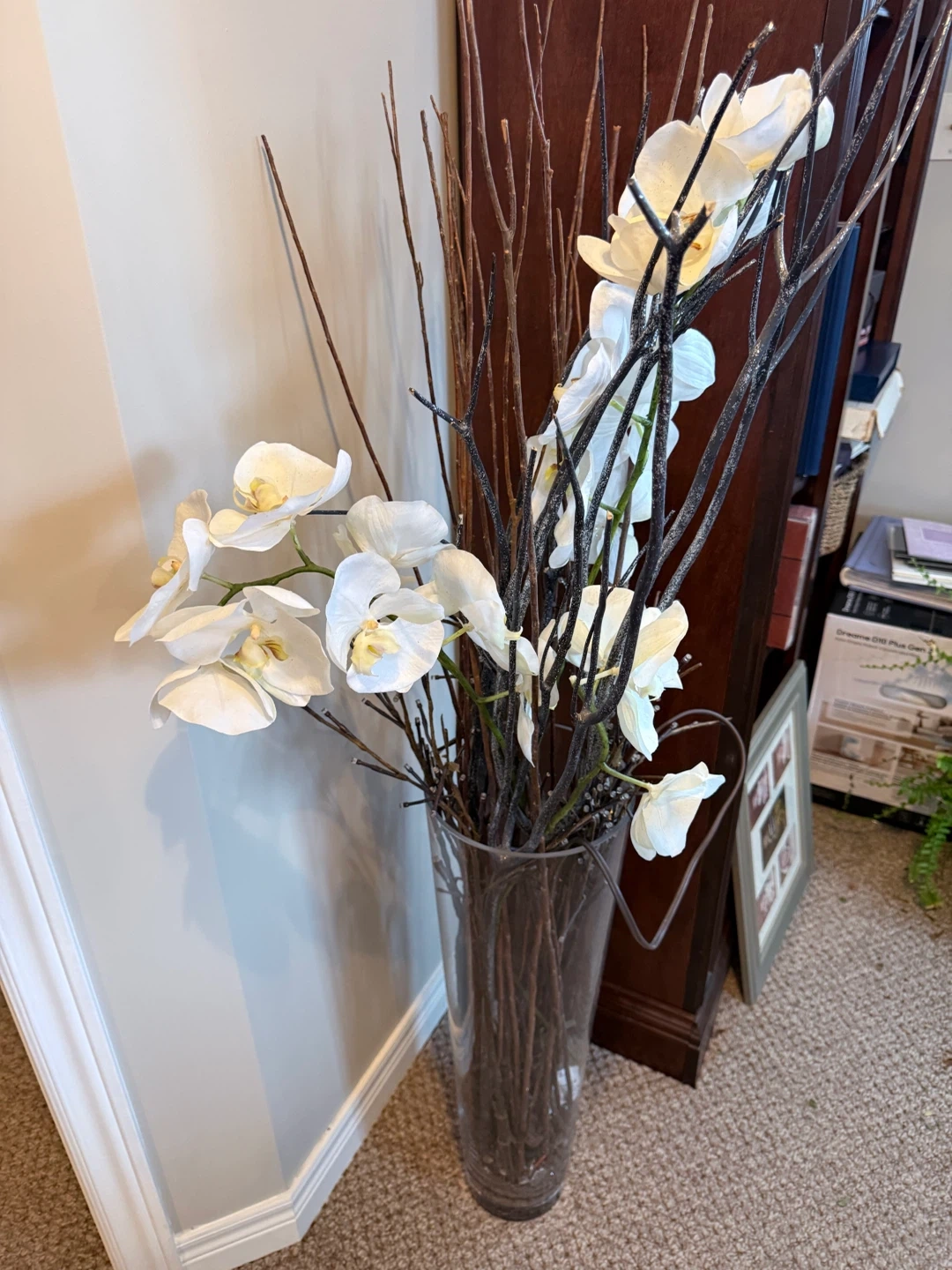 A lovely artificial white orchid arrangement in a tall, clear glass vase. It's accented with dark decorative branches. This piece adds a touch of elegance to any room.