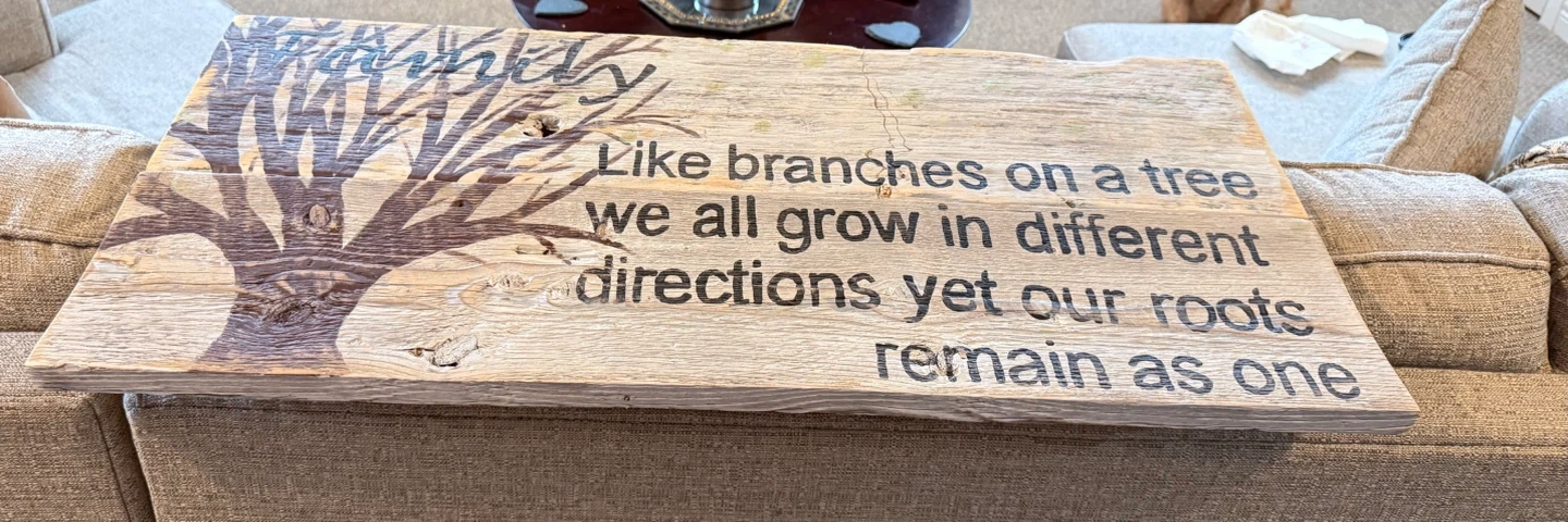 This wooden plaque features a tree design with the quote "Like branches on a tree, we all grow in different directions yet our roots remain as one." It's made of rustic wood and adds a warm touch to any home. This piece is suitable for family gatherings or as a heartfelt gift!