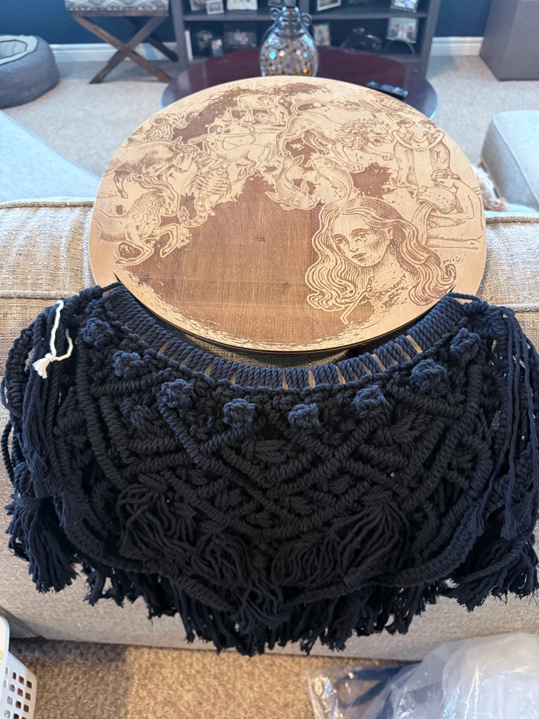 Round wooden wall decor featuring a detailed zodiac design with astrological symbols and figures. It's accented with a black macrame fringe around the bottom. This piece offers a unique decorative element for any room.