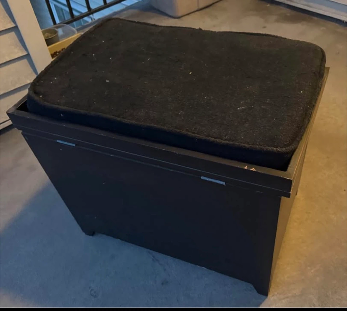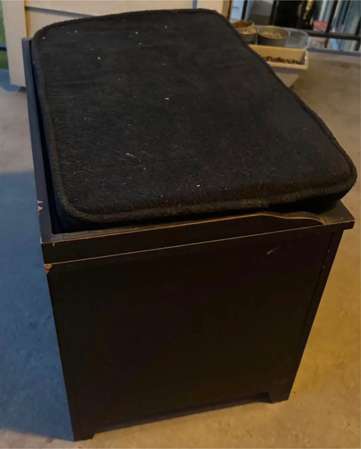 This storage ottoman bench is dark brown with a textured front panel. It includes a removable fabric liner for the main compartment. The hinged lid opens to reveal storage space. It's great for stowing away blankets or toys!