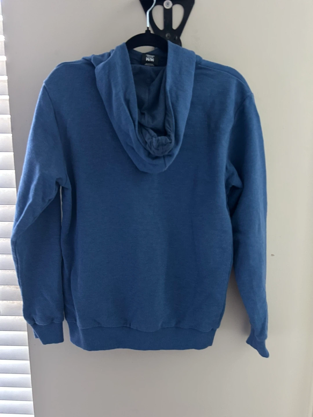 It's a size M. This pullover style is comfy for everyday wear. Missing hoodie drawstring.