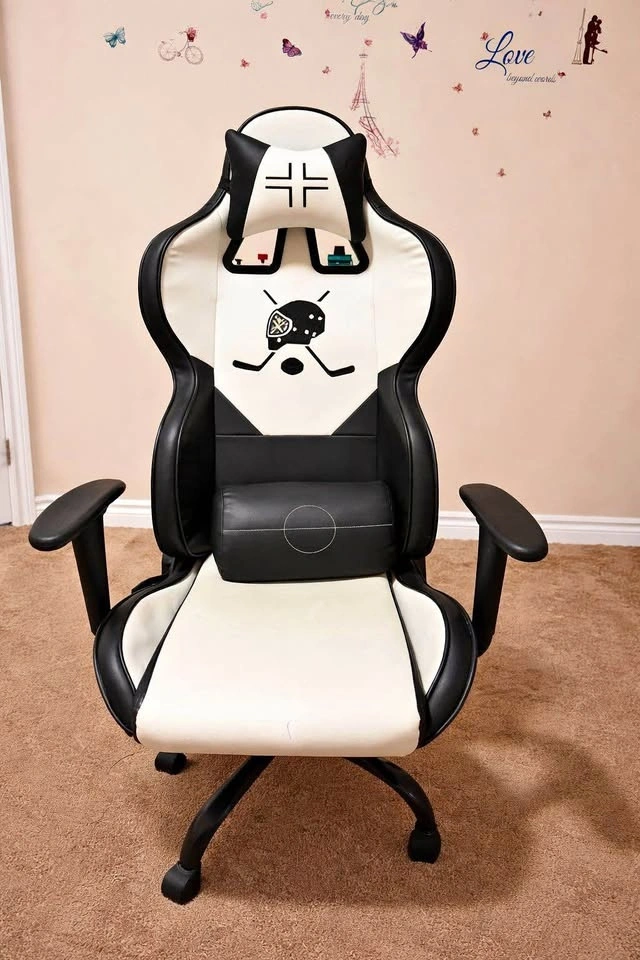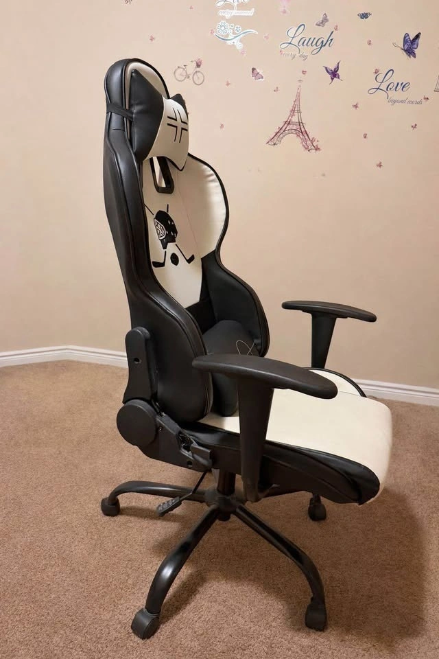 This is a comfortable gaming chair. It has adjustable armrests and lumbar support. The chair is made of breathable mesh material. It's in good condition.