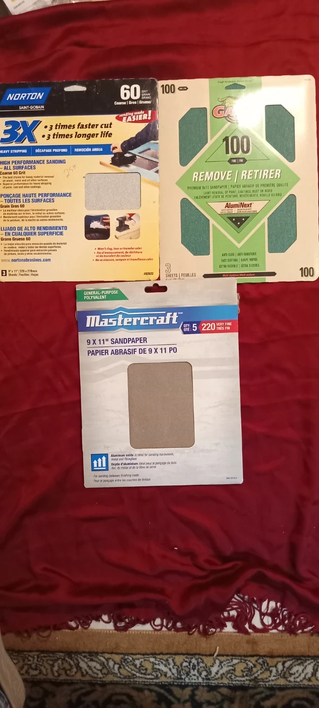 Bundle of assorted sandpaper sheets. Includes Norton 60 Grit, Gator 100 Grit, and Mastercraft 220 Grit. All sheets are 9x11 inches.