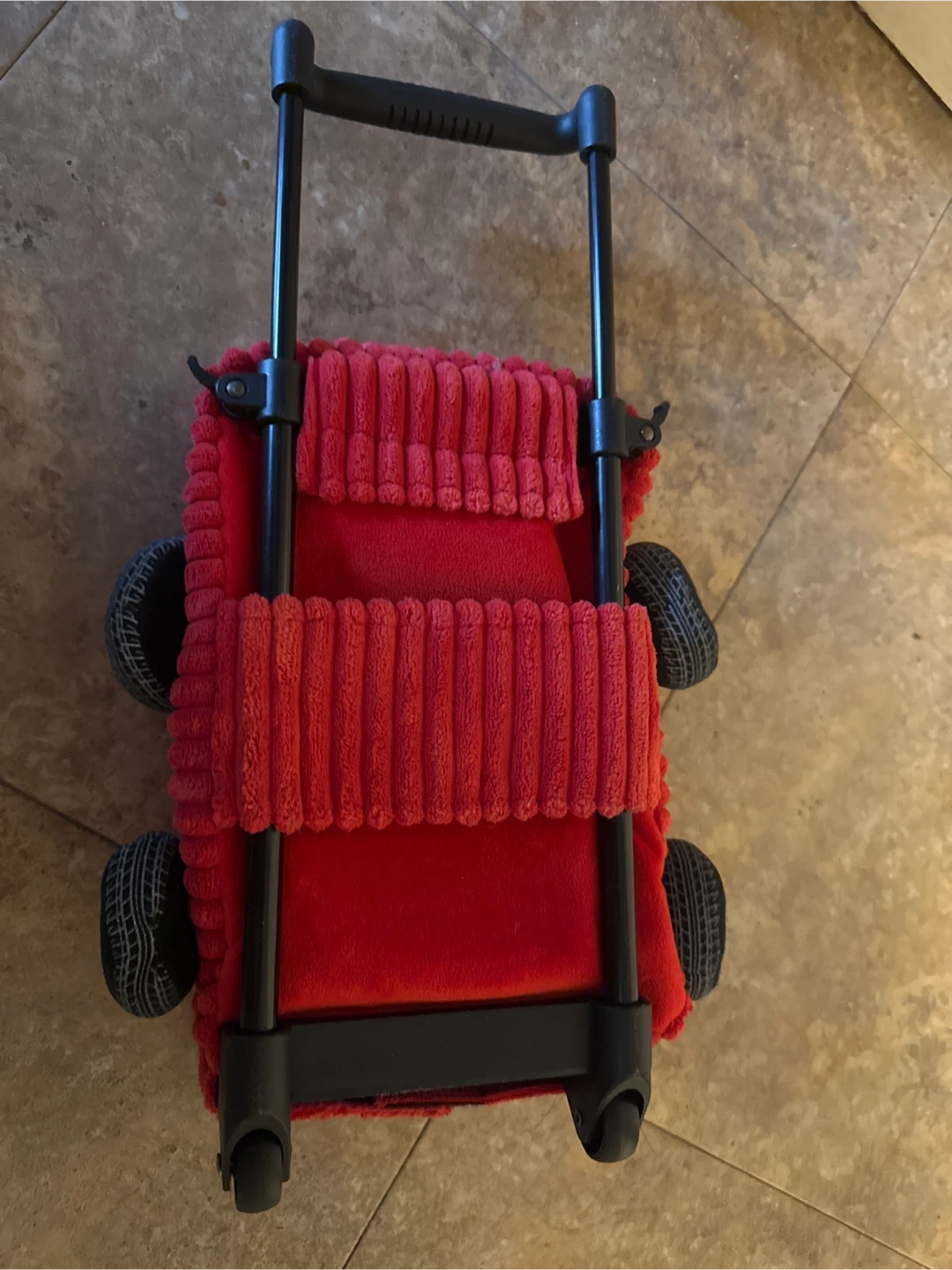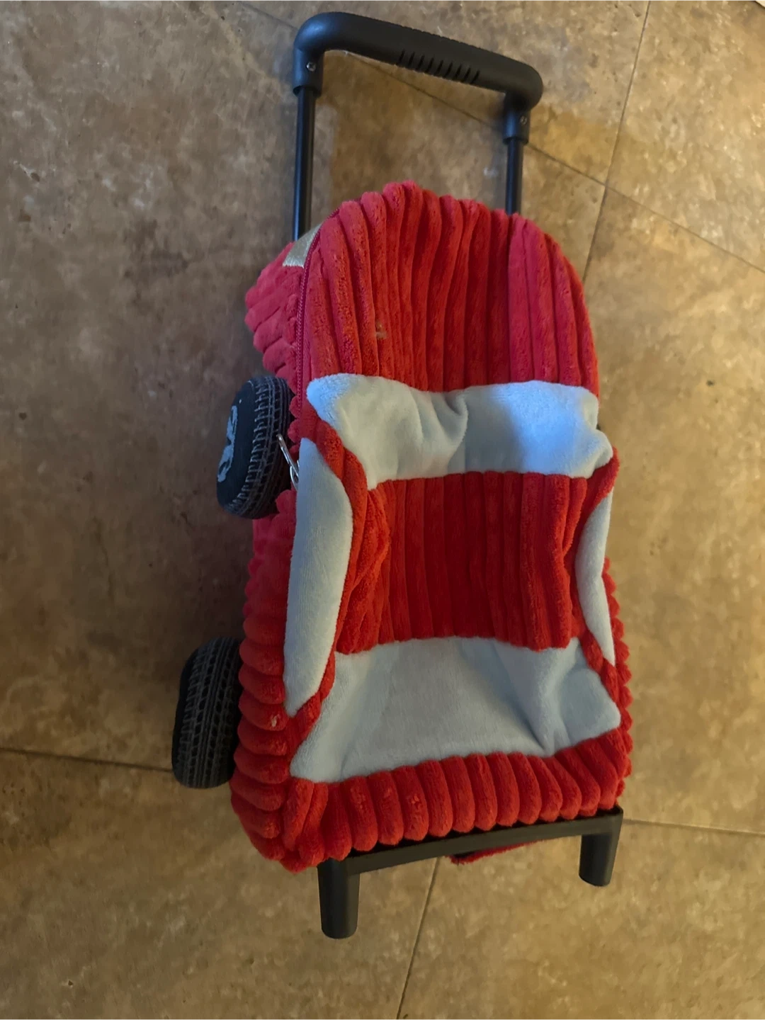 Kids rolling luggage designed like a red car with white accents. It's made of soft, plush material and features wheels and a retractable handle. Plenty of space inside for travel essentials!