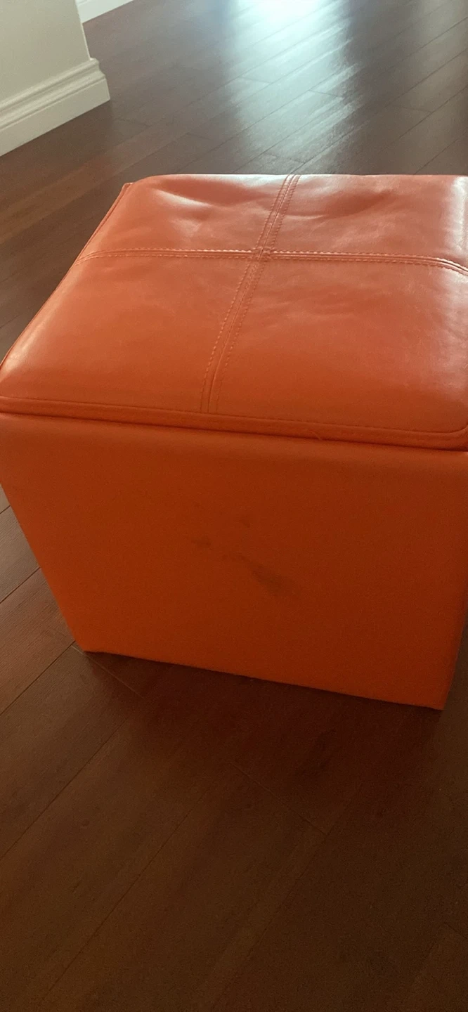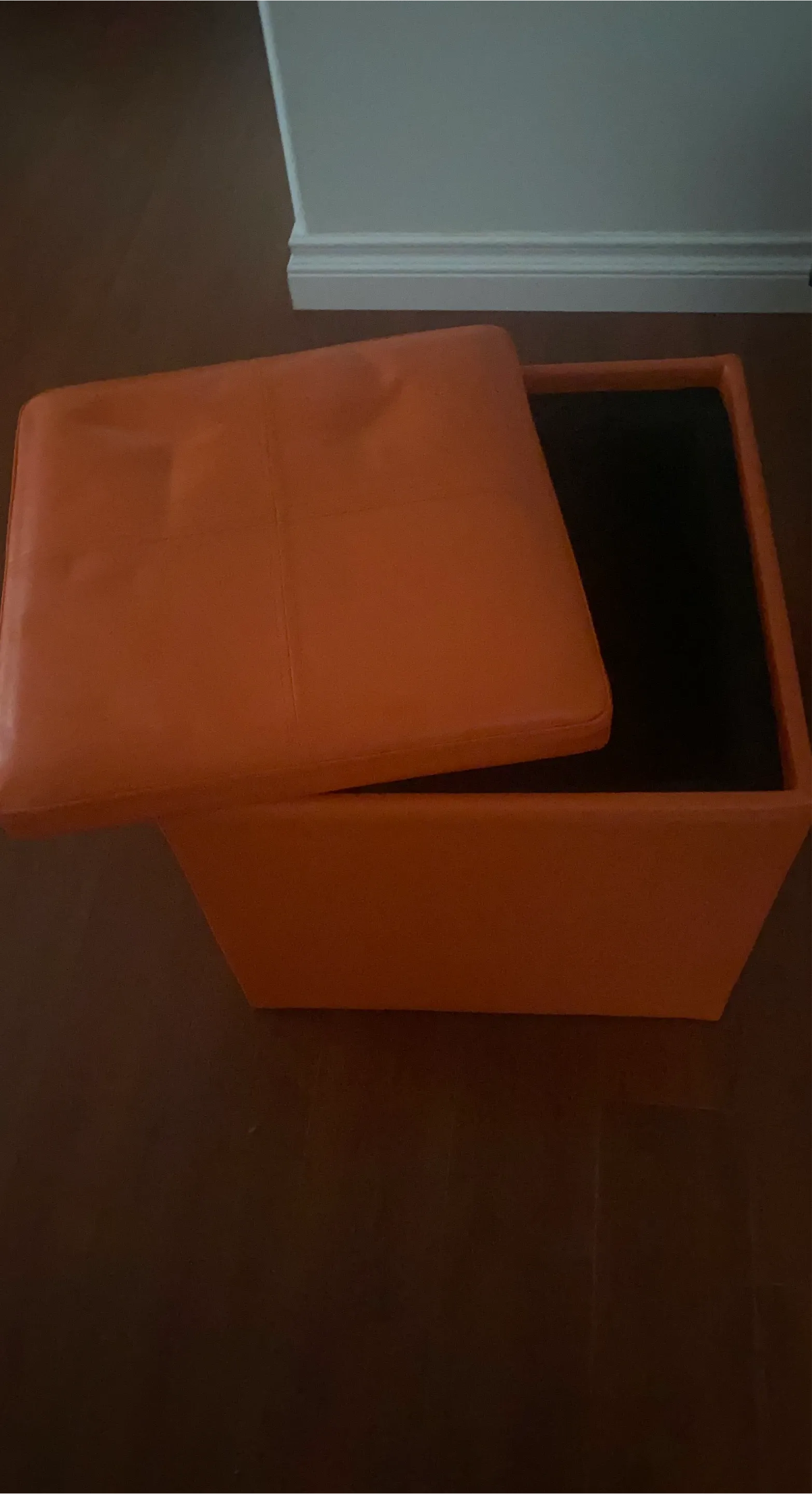 This orange storage ottoman offers a place to sit and tuck away items. It's made of faux leather and has a stitched top. The interior is lined with black fabric. Great for extra seating or stowing blankets!