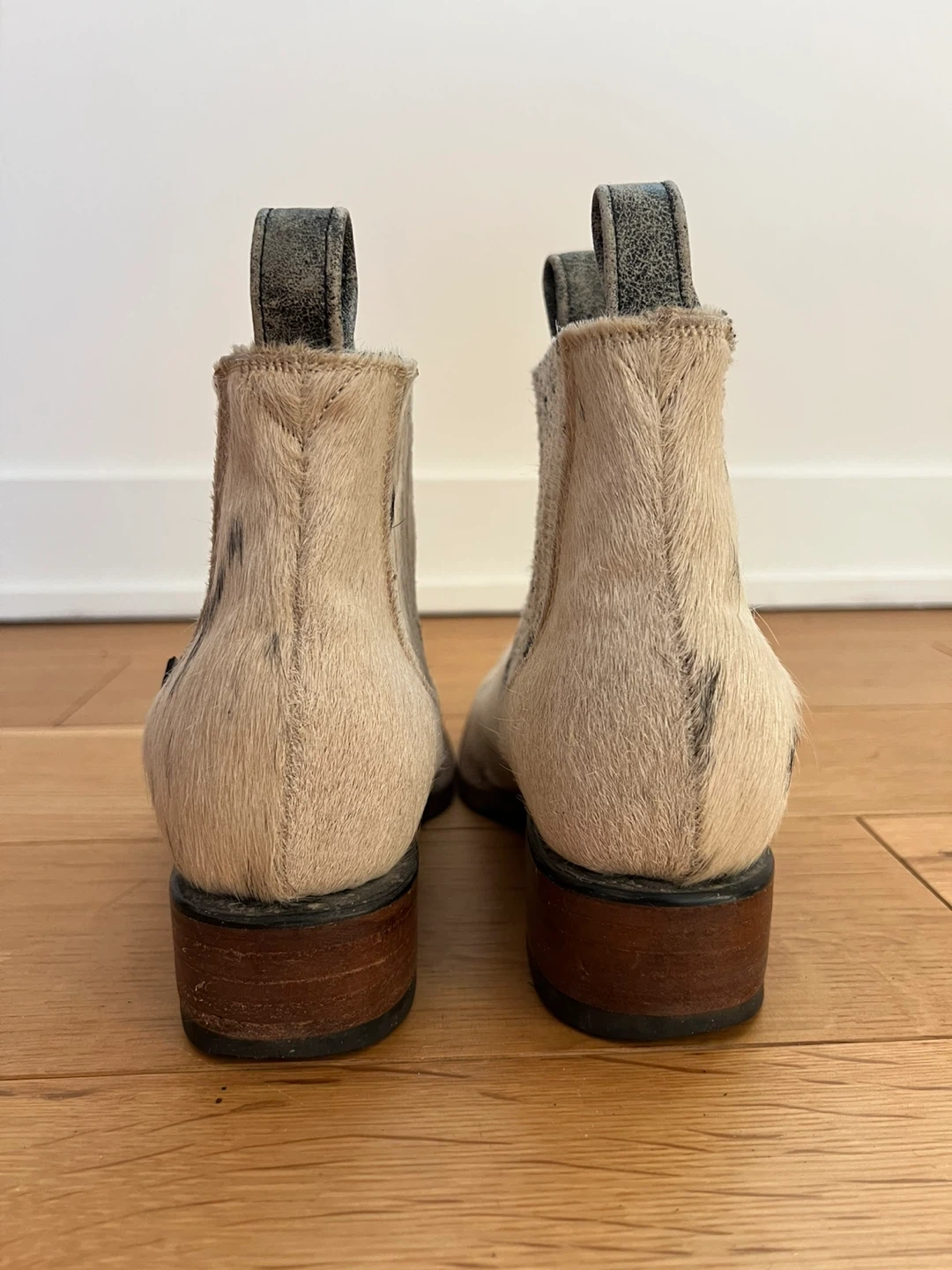 These Stiefeld ankle boots are made with genuine cowhide. Each pair is unique. In great condition, slight wear to the soles (see pics).