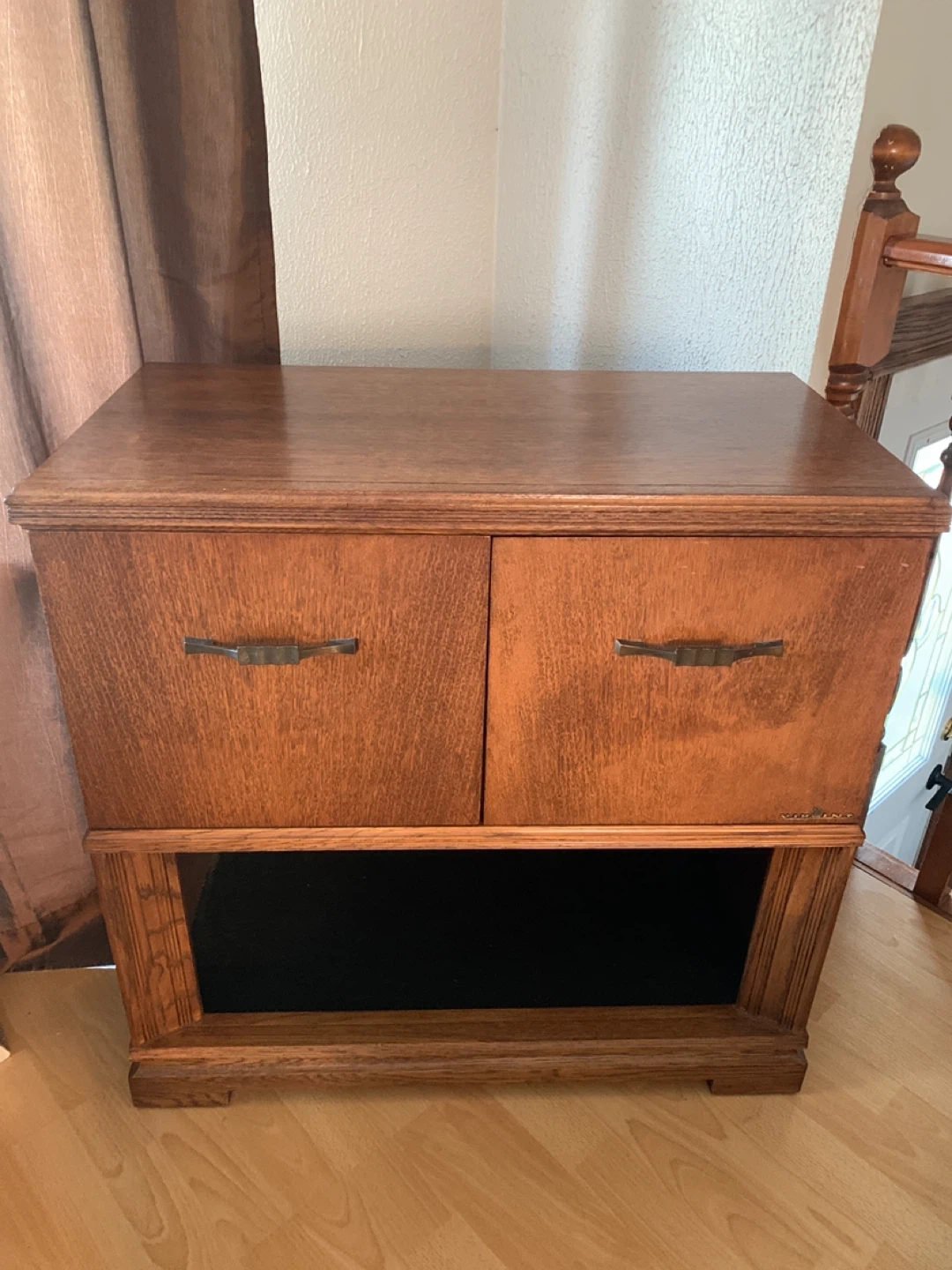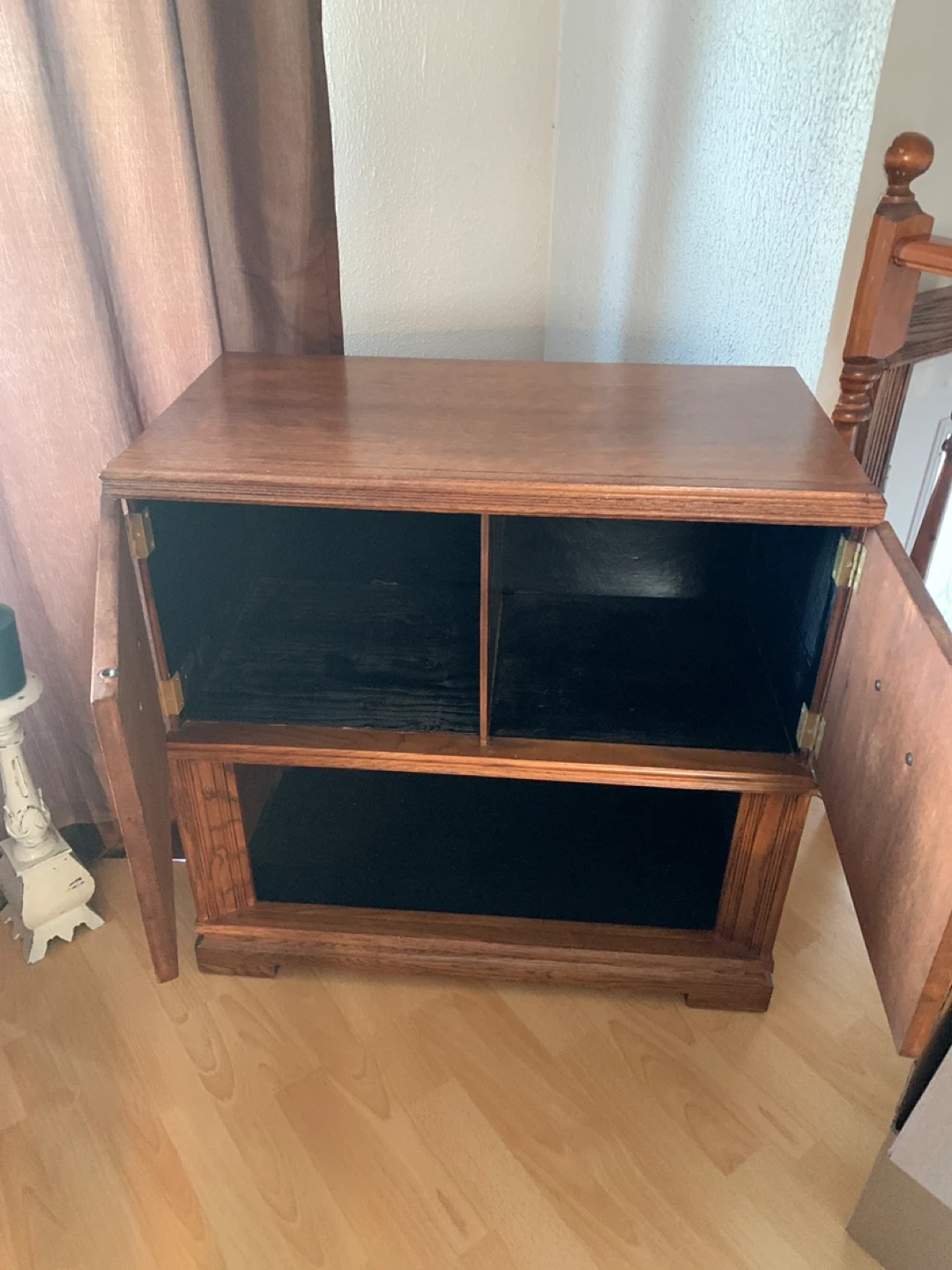 A sturdy wooden cabinet with two top doors and an open bottom shelf. It features a rich wood finish and brass-toned handles. This piece offers versatile storage options for your home.