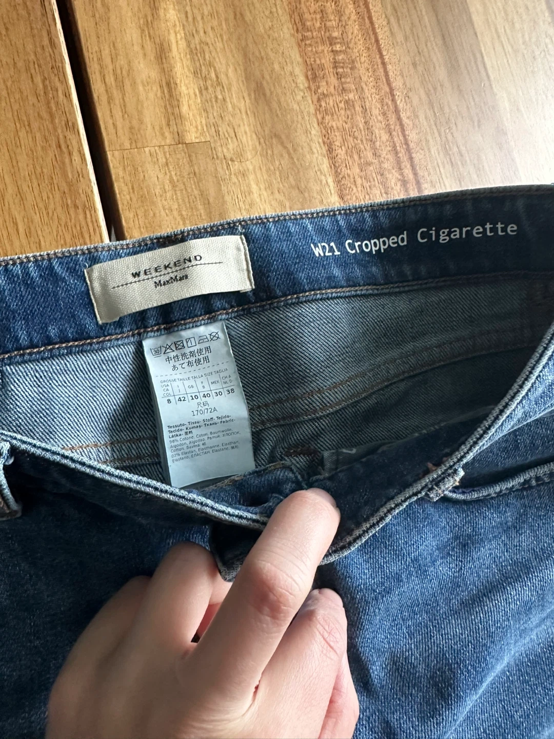 Weekend Max Mara W21 Cropped Cigarette Jeans in a size US 8. These mid-rise denim jeans are made from a cotton blend with elastane for stretch. They feature a classic five-pocket design with a button and zipper.