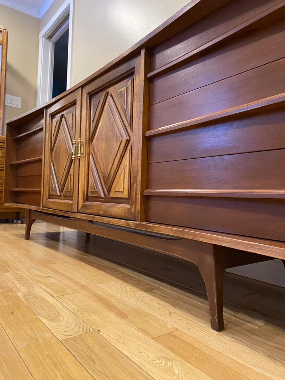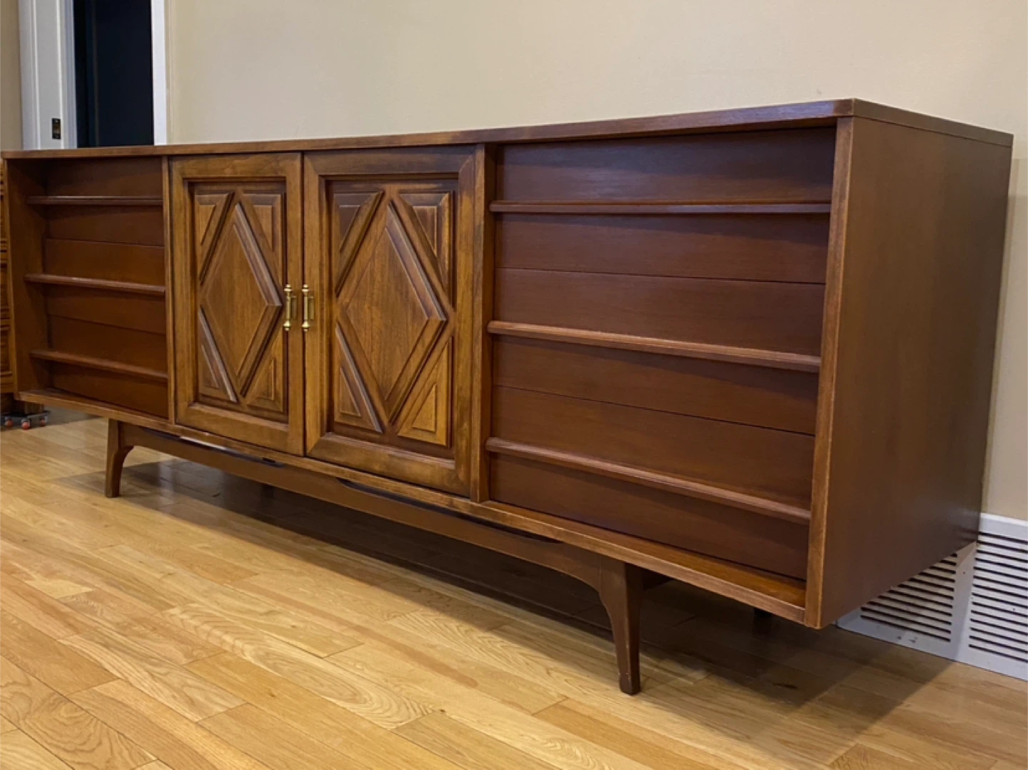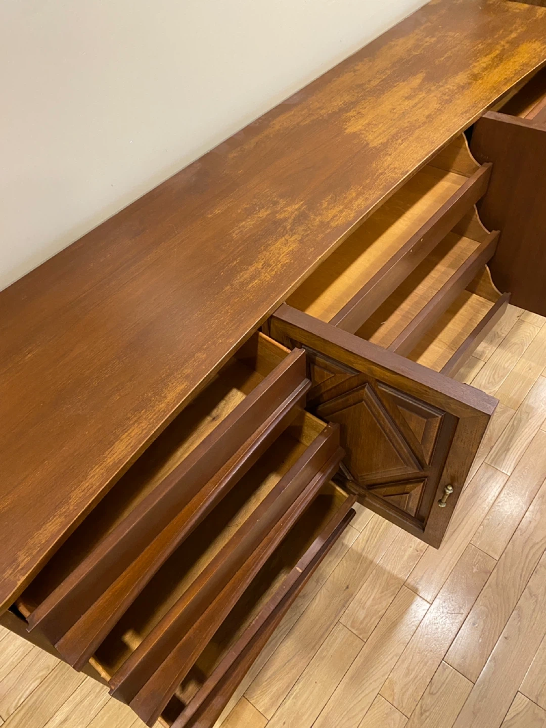 Stunning vintage mid-century modern walnut dresser with a long, low profile and beautiful architectural geometric door details. A high-quality, well-built piece from the 1950s–60s that works perfectly as a dresser, credenza, or media console.